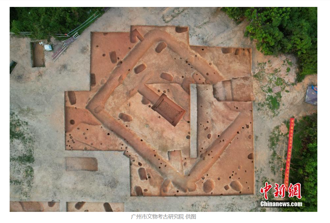 이에 국가문물국国家文物局 승인을 얻어 9월 이래 이번달에 걸쳐 정밀 발굴작업을 진행해 면적 700평방미터를 노출케 했다. 이때 비로소 이 언덕 정상부에서 네 귀퉁이로 도랑[해자]를 두른 서한西汉 남월국南越国 시대 대형 월인越人 묘장墓葬 1곳을 찾아냈단다.