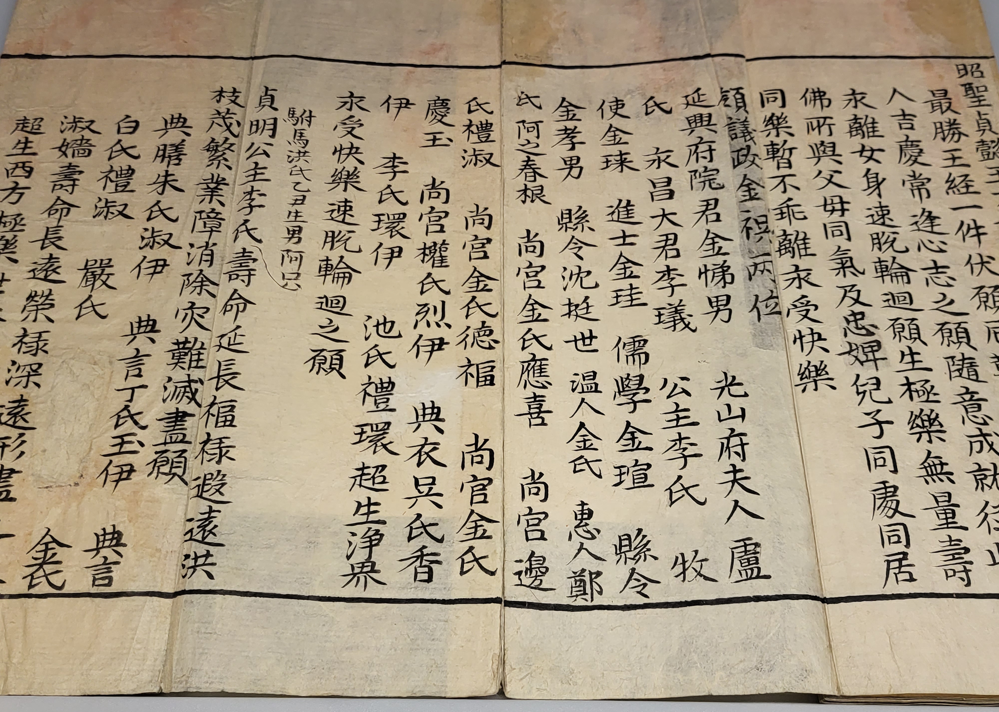 인목대비가 페위된 후 서궁西宮에 감혀있을 때 발원한 것으로 아버지 김제남金悌南, 어머니 노씨, 아들 영창대군의 극락왕생과 딸 정명공주의 장수와 자손 번성을 기원하였다.