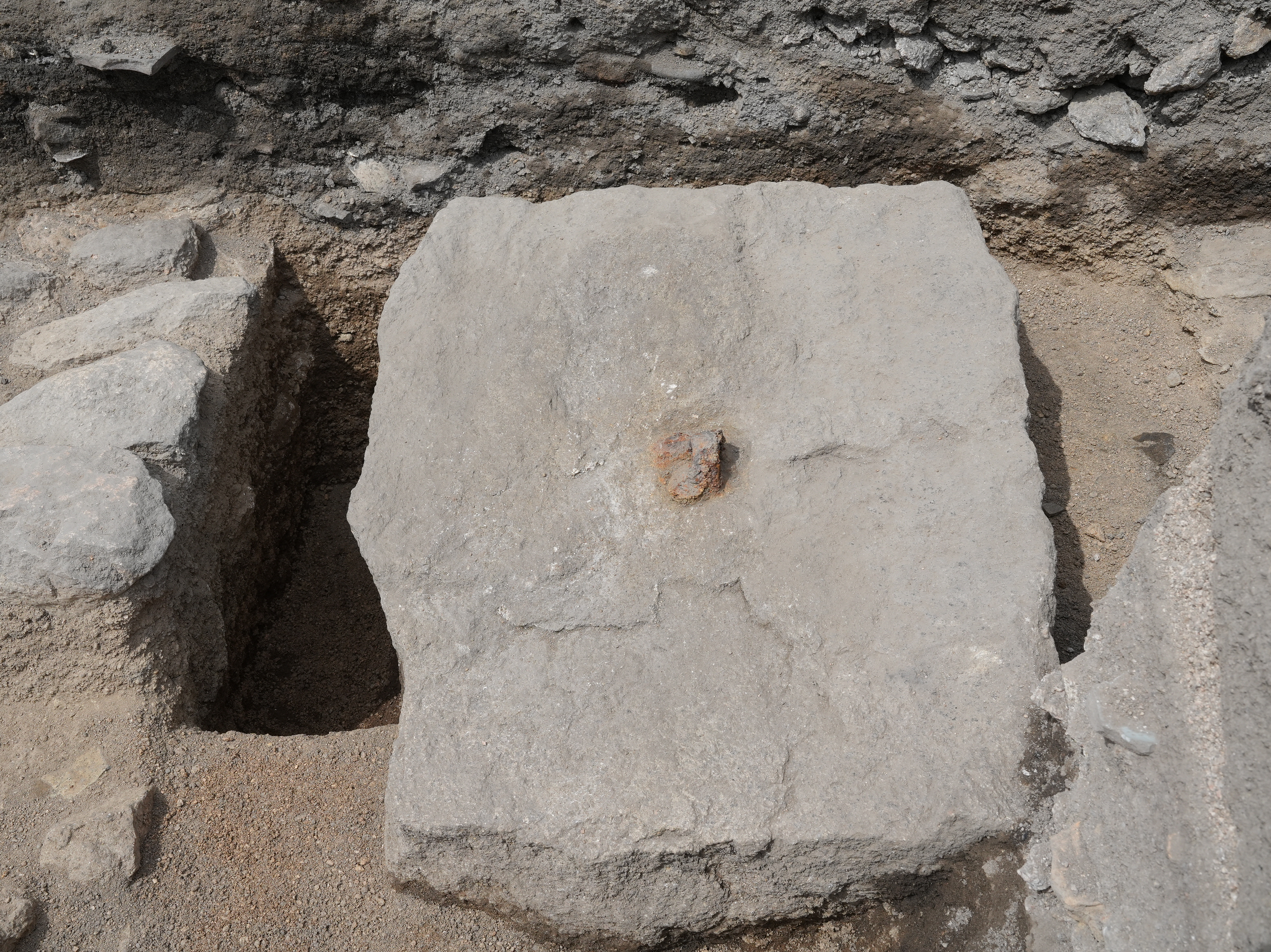 방형(사각형) 석재 1장(76×56×25cm)을 중심으로 양쪽에 남북방향으로 돌을 한 줄씩 배치한 모습이다. 특이한 점은 방형 석재 중앙에는 지름 6cm가량 철제 고정쇠가 박혀 있다는 사실이다.