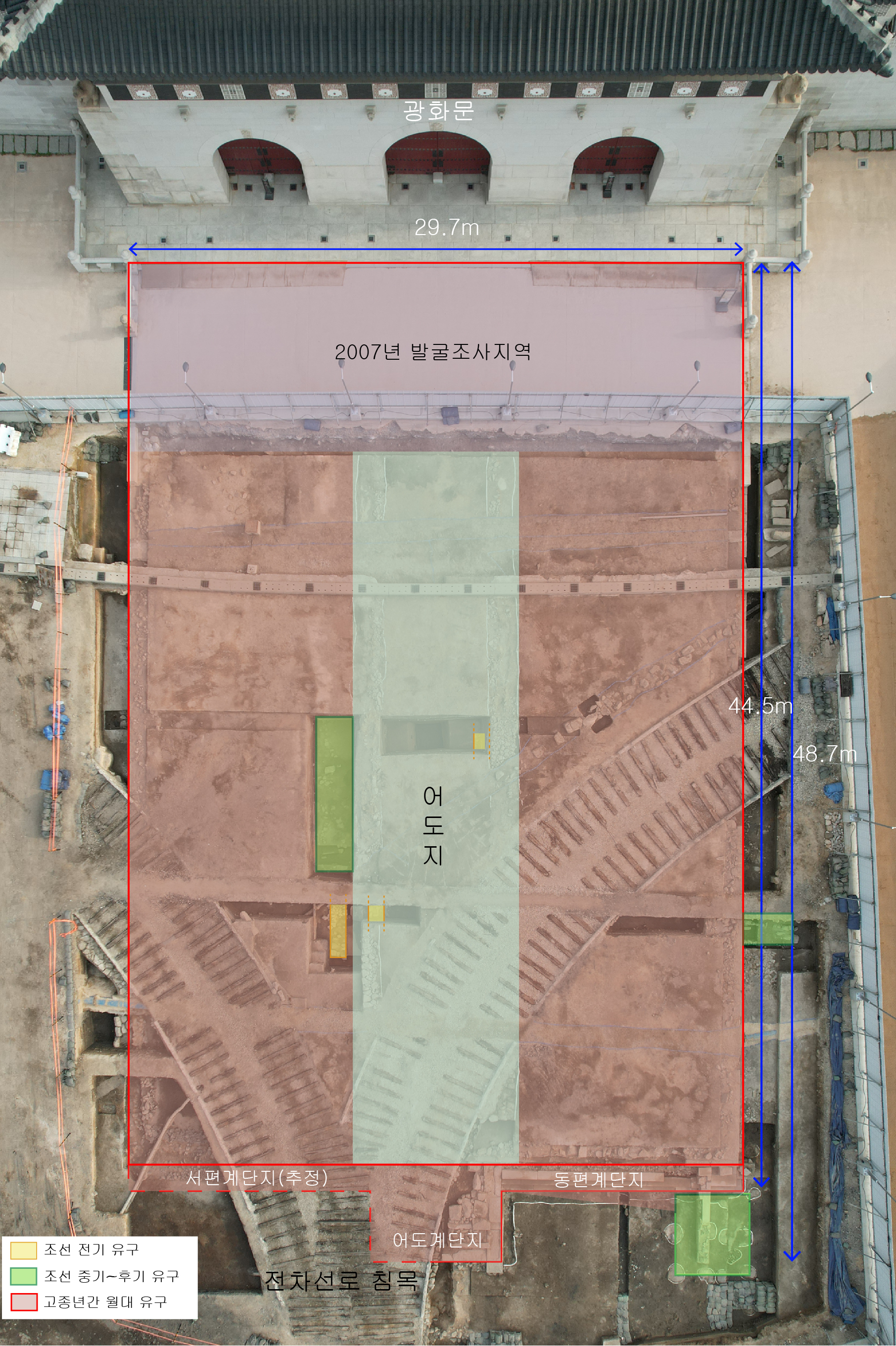 구체로 보면 조선전기 문화층은 앞선 2007년 광화문 발굴조사에서도 확인된 층으로, 이번에 발굴한 유구는 고종년간 월대 어도지御道址(이 무슨 개떡 같은 말인지?) 서쪽 기초시설 아래쪽 약 120㎝ 지점에 위치한 조선전기 문화층 가장 위쪽에서 확인했댄다.