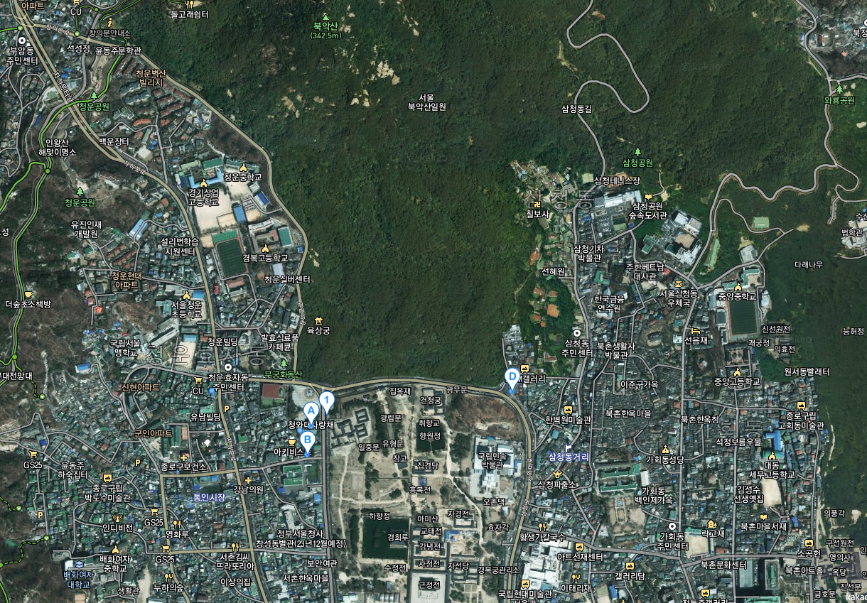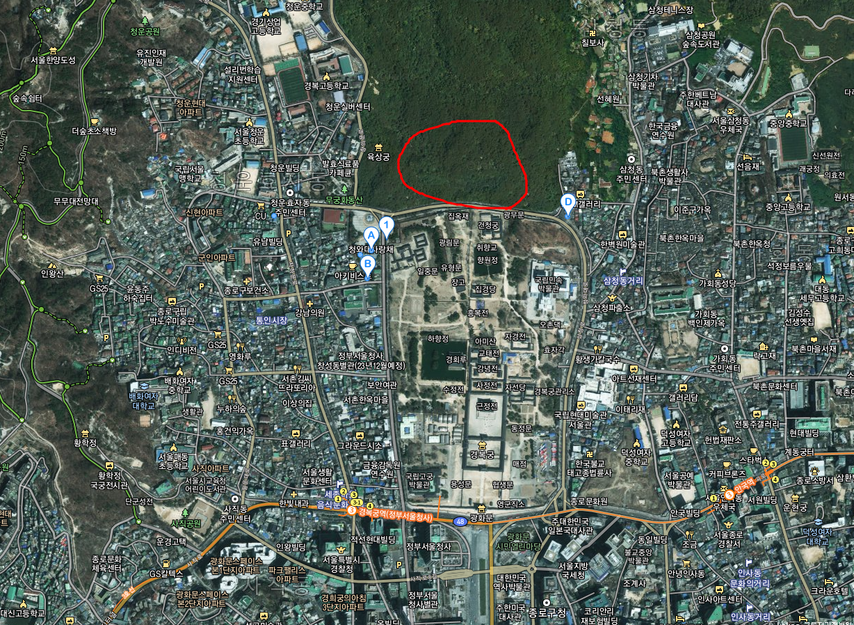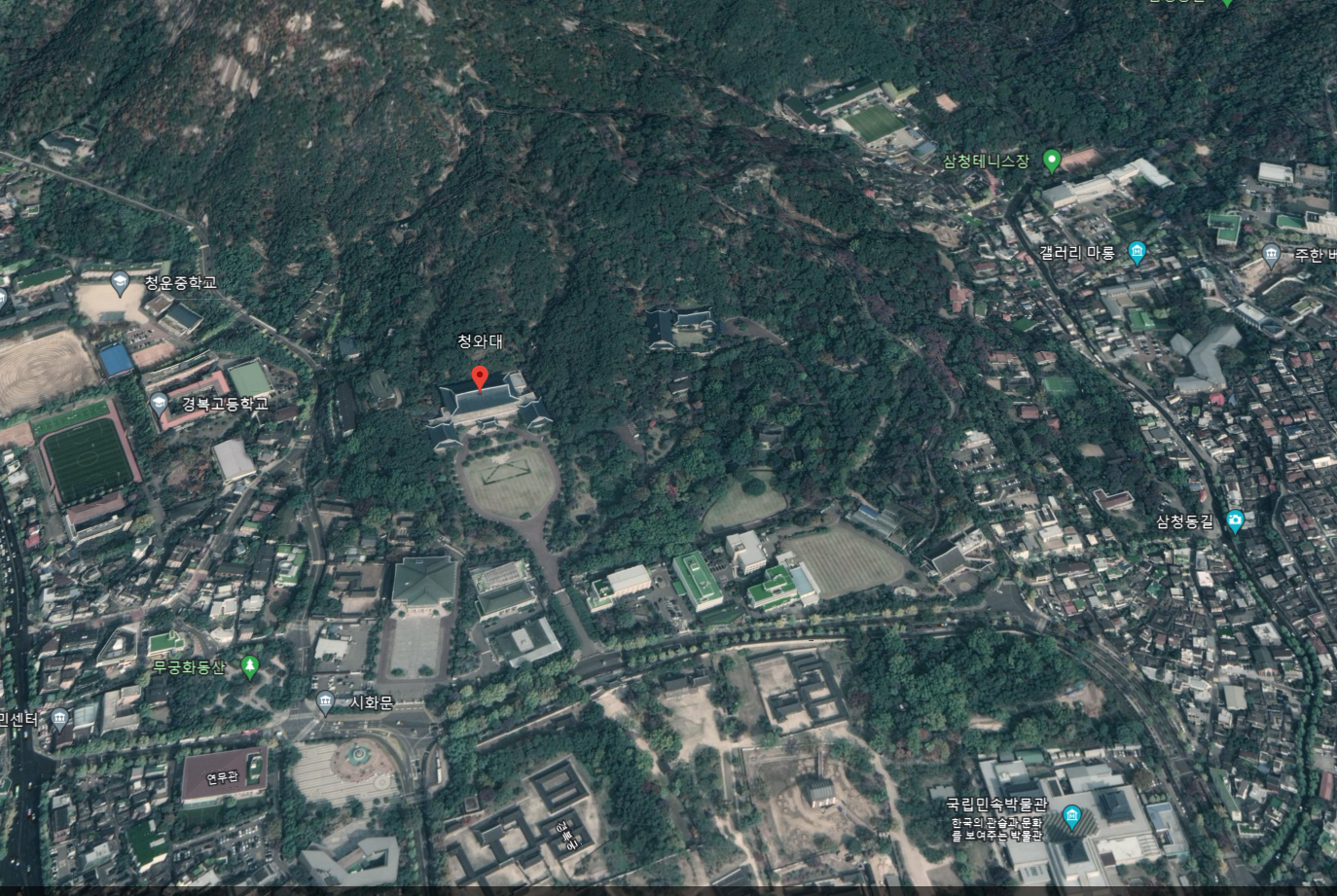 같은 지점 구글어스다. 보다시피 청와대 건물이 모조리 다 나온다. 청와대라 표시된 저 부문은 대통령 집무실이라 하지만 실은 저짝에 잘 없다. 기자들 앞에서 사진 찍으러나 나오는 데다.
