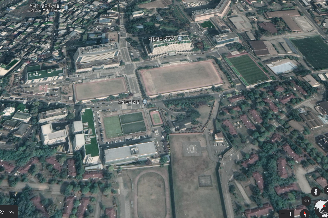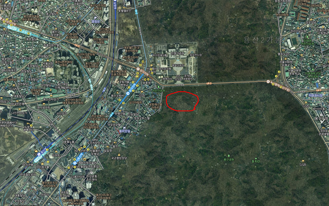 요새 대통령 집무실 새로운 후보로 오른다 해서 인구에 회자하는 용산 국방부 일대 다음위성 지도다. 역시 붉은 색으로 칠한 부분에 들어가야 하는 국방부 청사 건물은 물론이고, 그 일대 다른 군사시설은 모조리 녹지로 처리됐다.