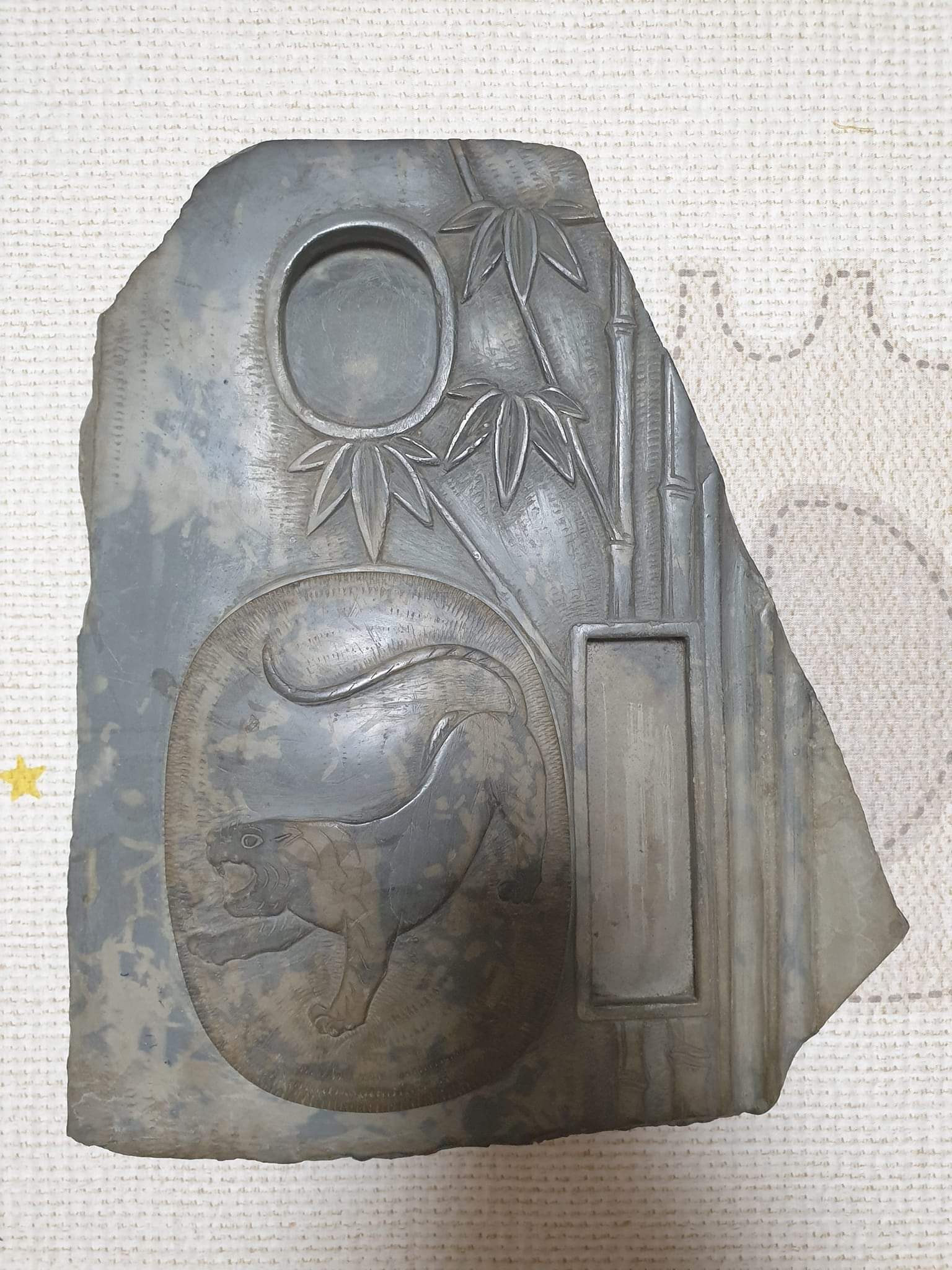 벼루 위에 뚜껑 하나가 얹힌다. 꽤 얕게 호랑이를 새겼는데, 대나무 숲에서 호랑이가 나오니 맹호출림猛虎出林인가, 그런데 호랑이 위에 둥근 공간 하나가 더 있다.