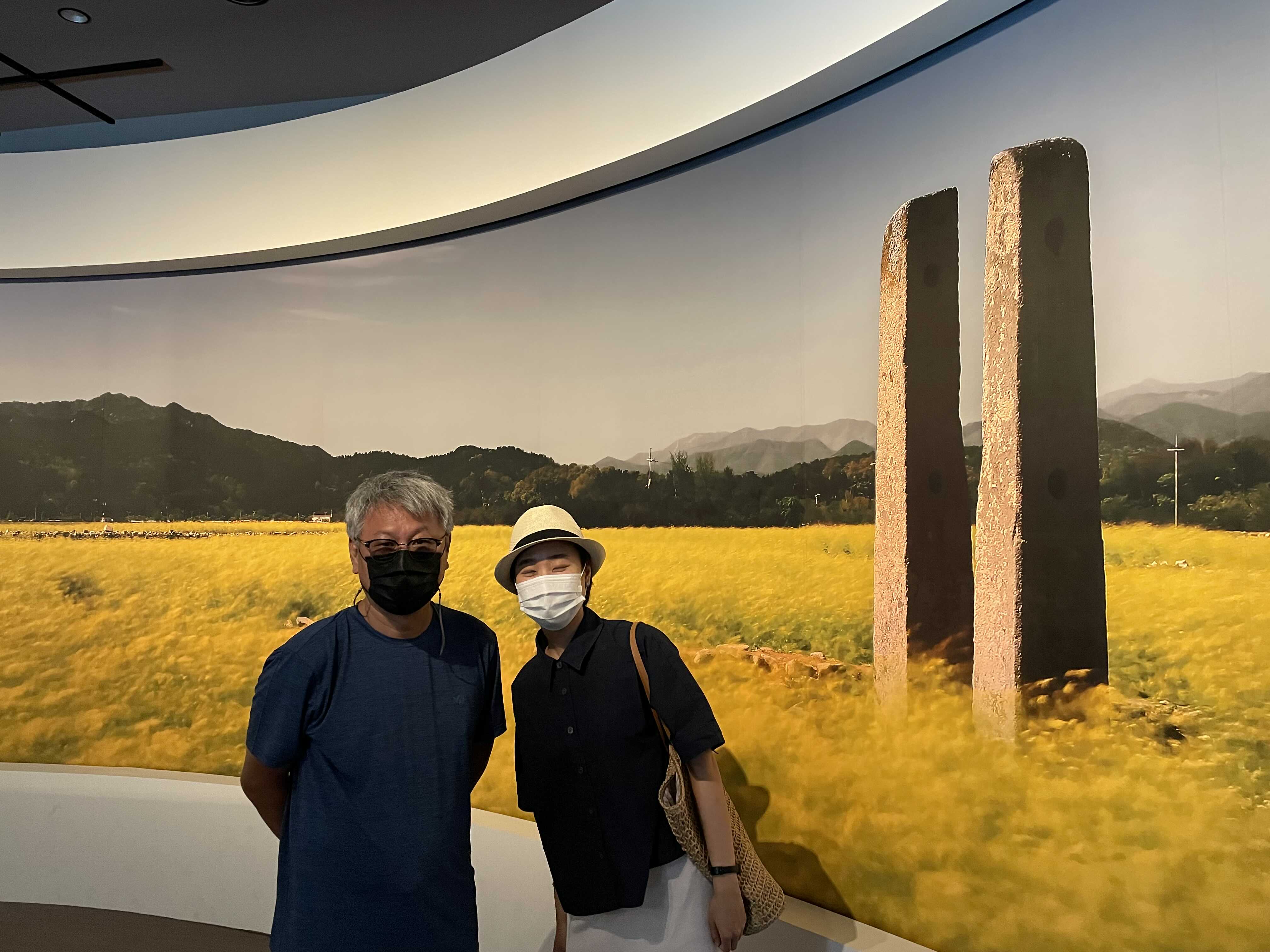 황금물결이 일렁이는 구황동 당간지주 작품 앞에서 많은 사람들이 사진을 찍었습니다.