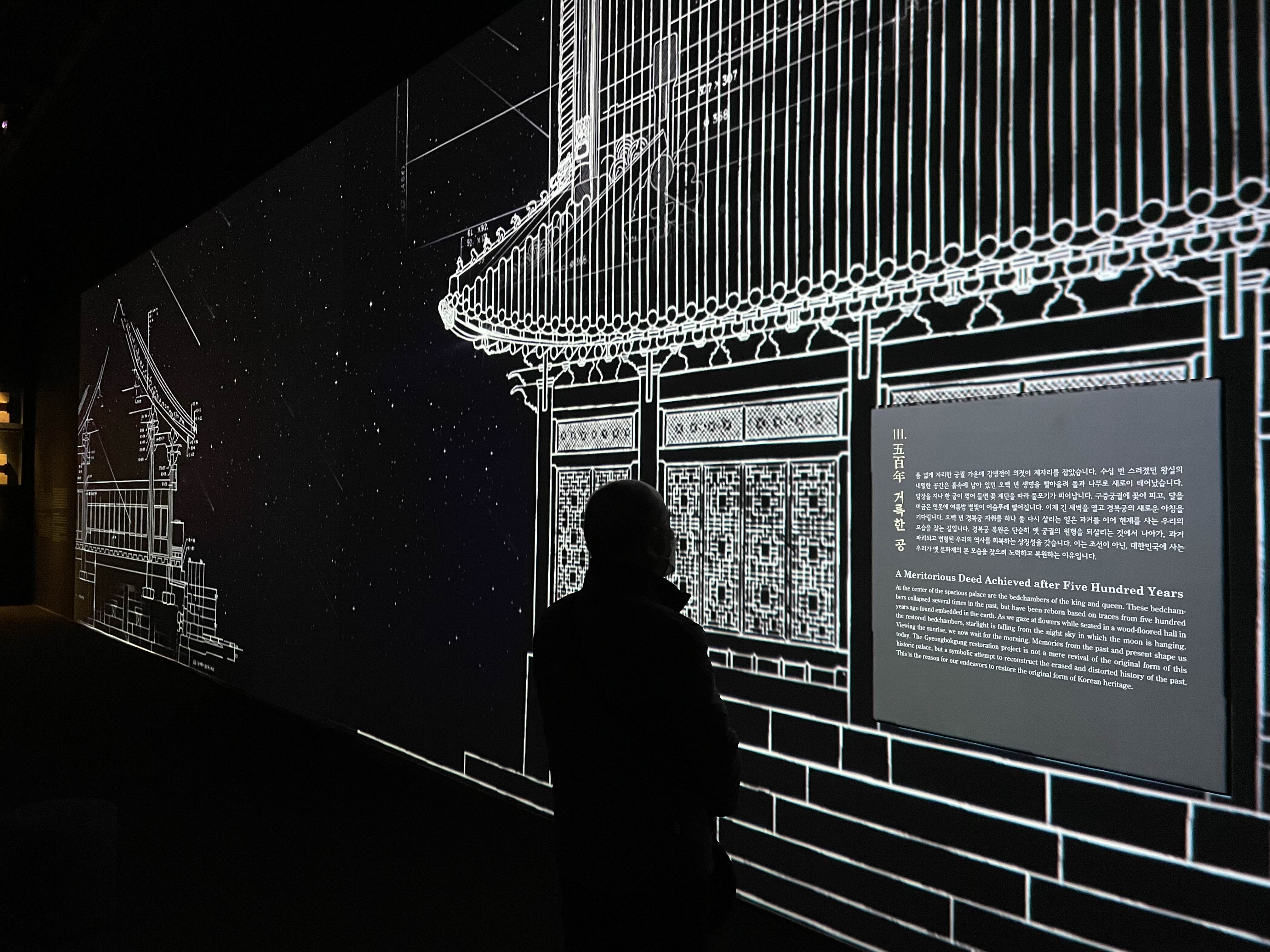 경복궁 발굴에 참여한 모든 분의 이름이 벽면 가득 떠오르고, 그분들 덕분에 이렇게 멋진 고궁을 우리가 볼 수 있게 되었다는 듯 화려한 꽃잎으로 영상이 바뀝니다.