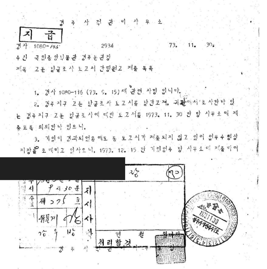 1973년 경주사적관리사무소가 국립중앙박물관으로 발송한 공문을 첨부한다.