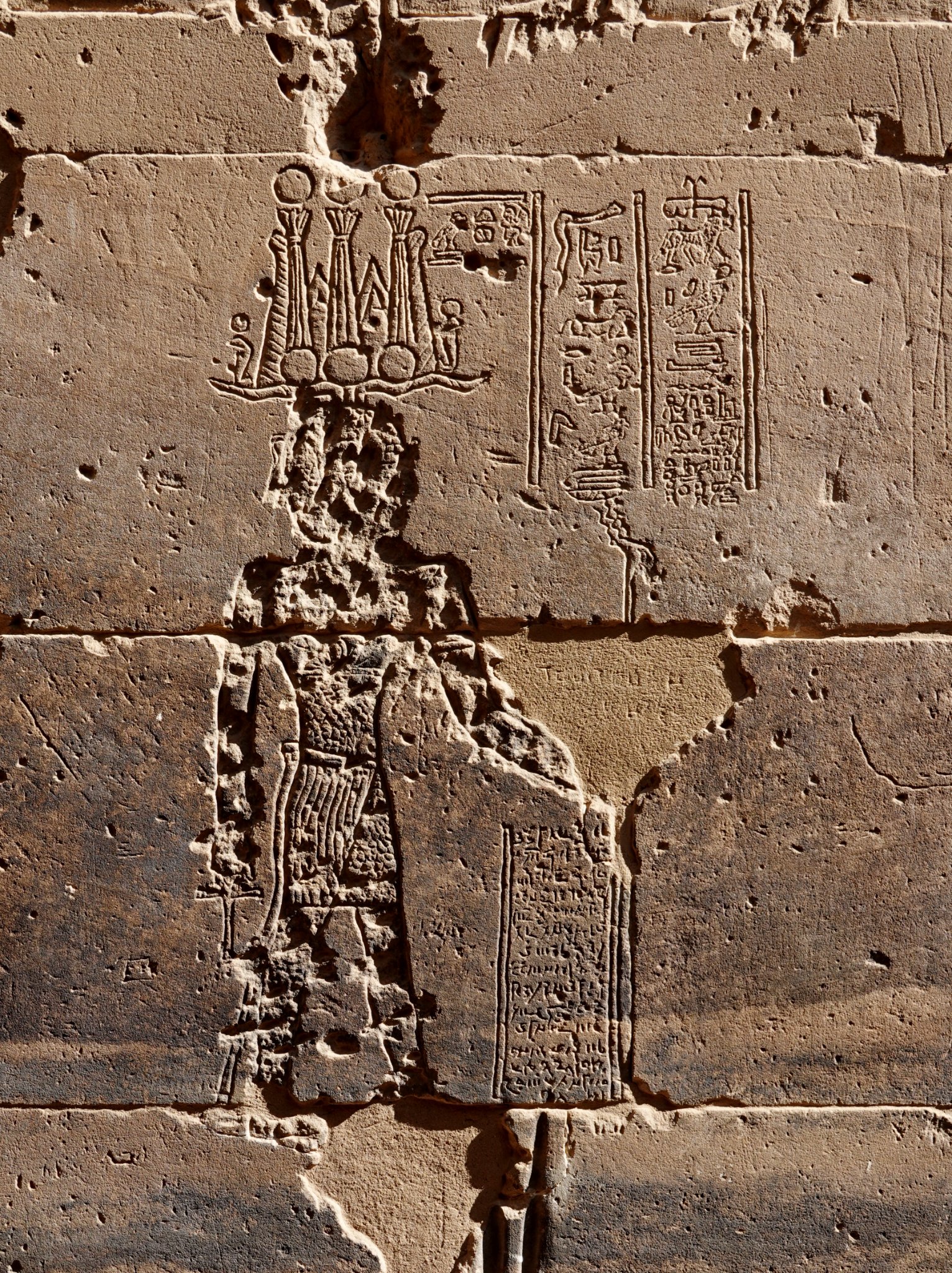 상형문자가 새겨진 세로단 아래에는 당시 일상생활에서 사용한 민용문자(民用文字: demotic) 텍스트가 상형문자 텍스트보다 좀 긴 분량으로 새겨졌는데 이 민용문자 텍스트 말미에 이들 텍스트가 새겨진 날이 디오클레티아누스(Diocletian: 284-305년) 황제 치세 100년째가 되는 해 오시리스(Osiris)의 탄생 축일이었다는 사실이 기록되어 있습니다.