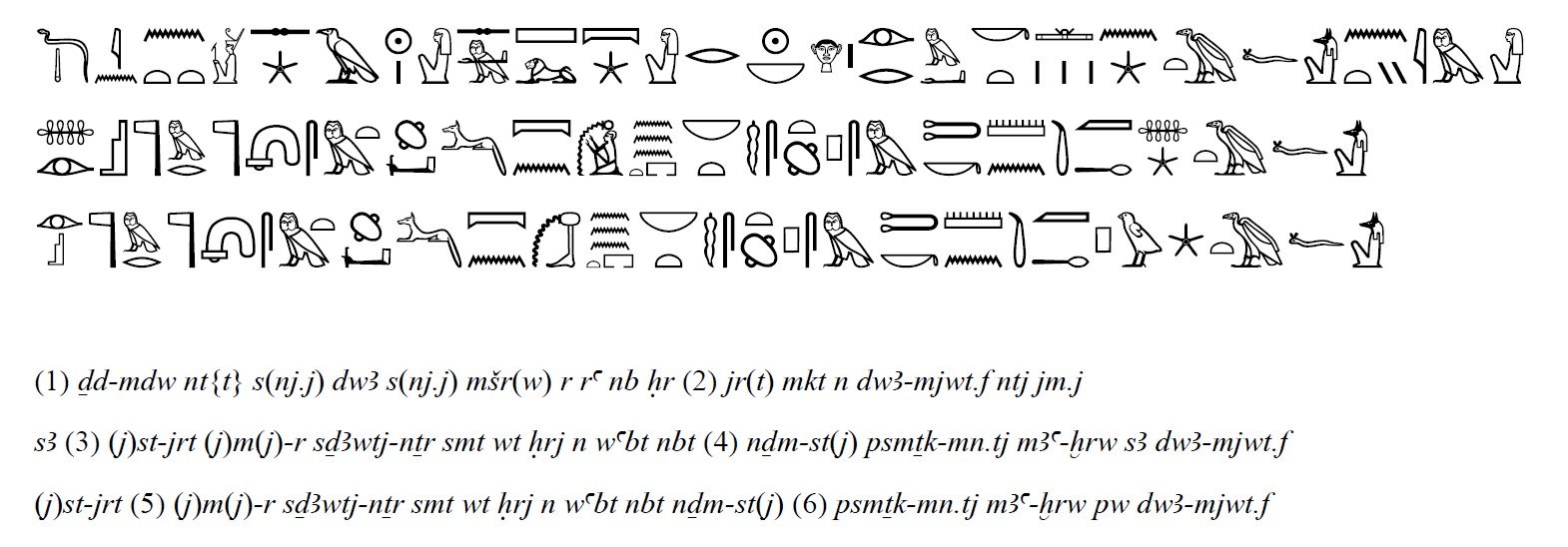 “네이스 여신의 언명(言明): 나는 매일 아침 저녁을 내 안에 있는 두아무테프를 보호하기 위해 보내노라. 오시리스, 신전 수석 재무관, 셈-신관, 미라 제작자, 모든 미라 제작소 감독관, (신전) 향 담당 신관, 진실된 목소리 프삼테크-멘티를 위한 보호는 두아무테프의 보호이다. 오시리스, 신전 수석 재무관, 셈-신관, 미라 제작자, 모든 미라 제작소 감독관, (신전) 향 담당 신관, 진실된 목소리 프삼테크-멘티가 (바로) 두아무테프이다.”