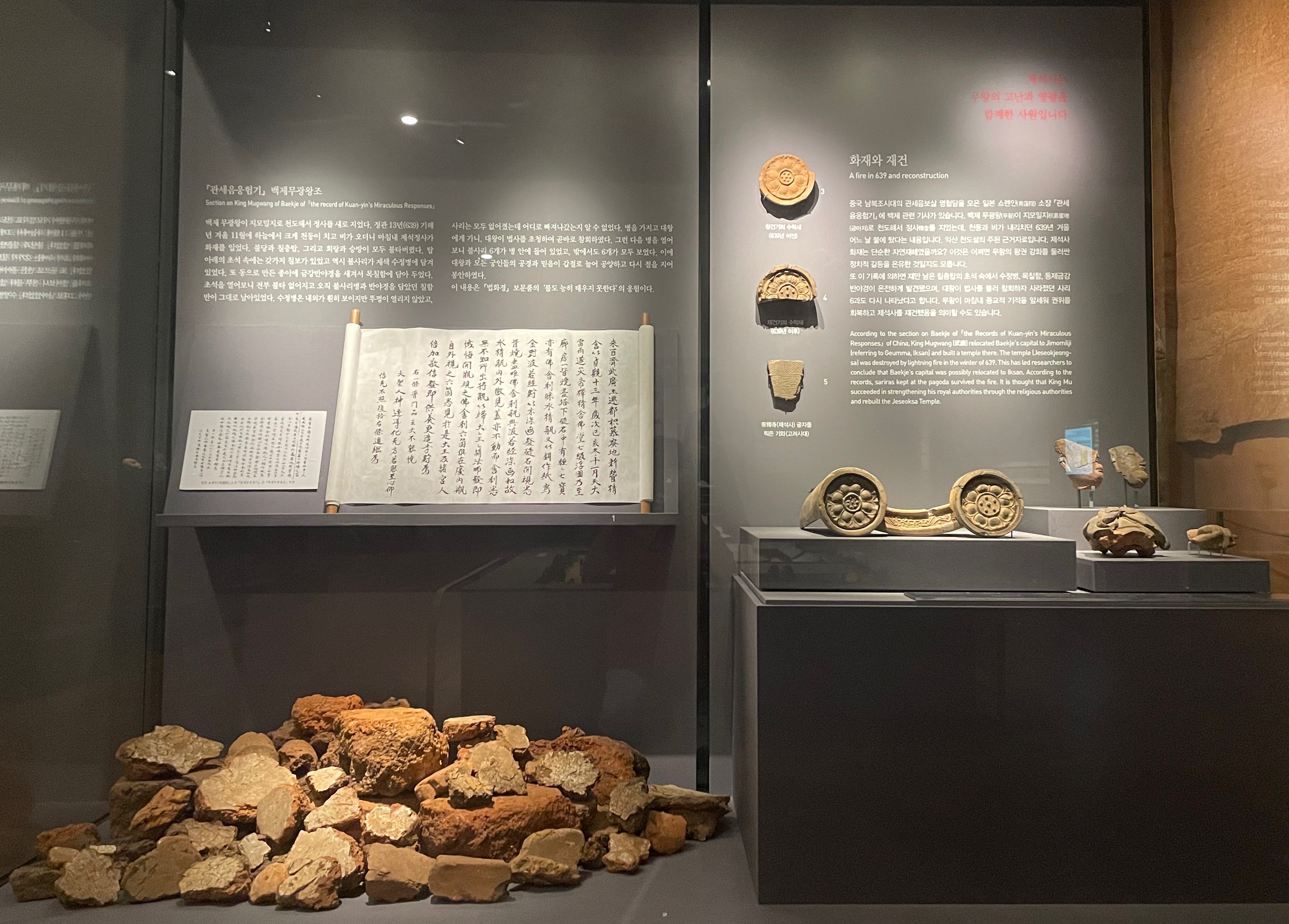 ‘익산 천도’를 이야기하고 있는 일본 쇼레인 소장 ‘관세음응험기(觀世音應驗記)’ 복제품 / 百濟 武廣王 遷都 枳慕密地 新營精舍 백제 무광왕(무왕)이 지모밀지(금마저)로 천도하고 정사(절)를 새로 지었다. -생략- / 전시 설명글 중