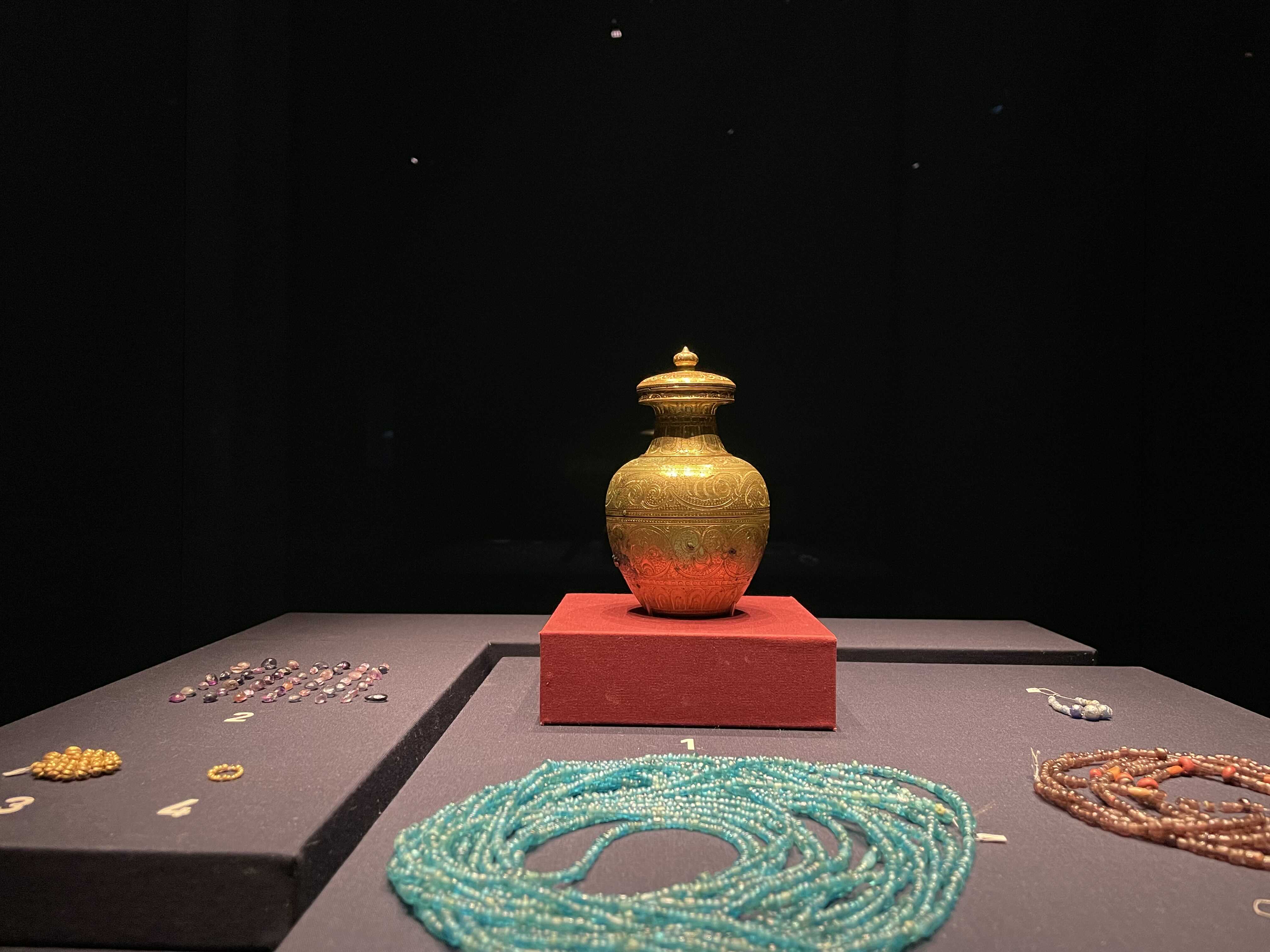 사리병(복원품) / 금제 내호 안에는 유릭구슬, 금구슬과 함께 유리제 사리병이 담겨있었습니다. 유리제 사리병은 사리기 가장 안쪽의 용기로 그 안에 사리를 직접 봉안한 것으로 보입니다. / 내용 출처 : 박물관 설명글
