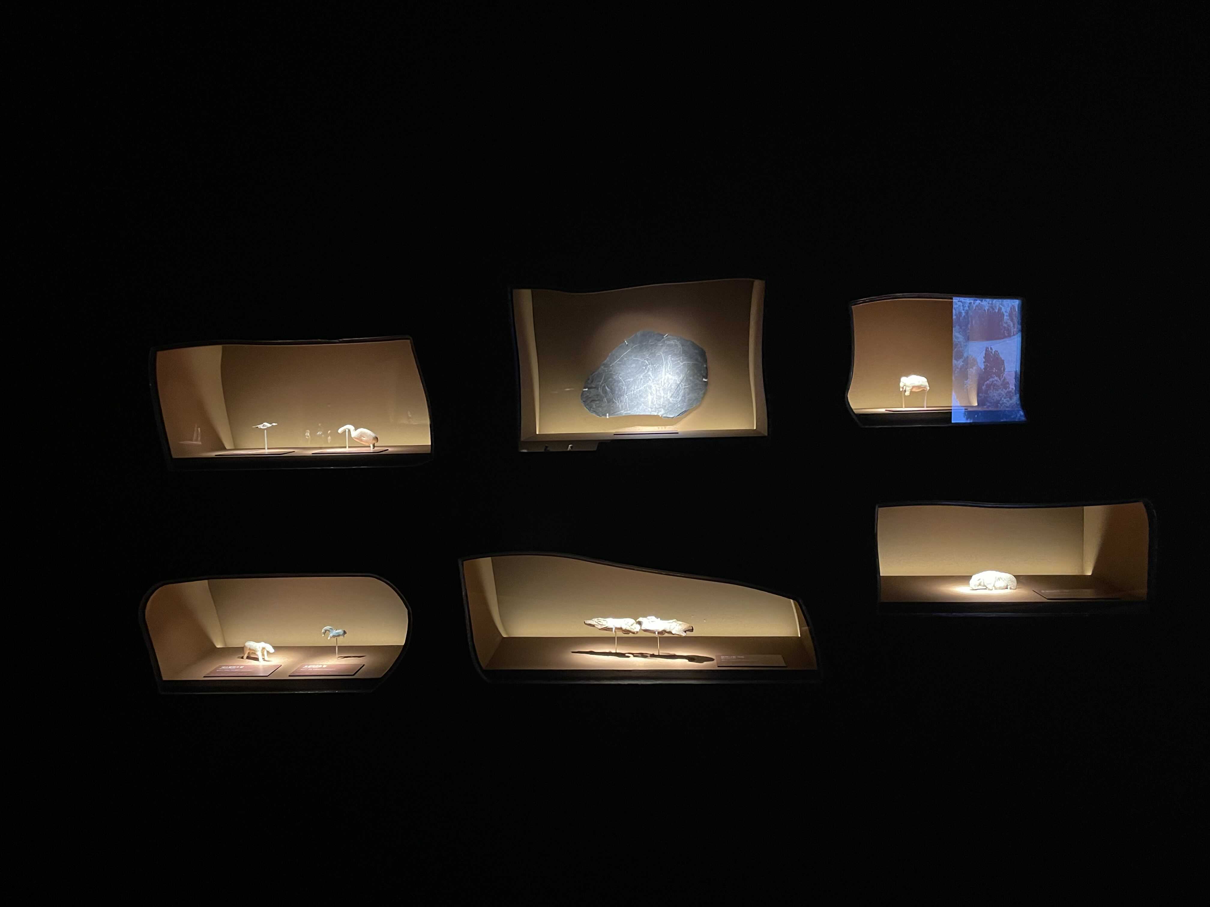 동굴을 들어가는 느낌을 주기 위해 전시실을 복도 형태로 꾸미고 조도를 확 낮추었습니다. 도입부에는 동굴벽화를 보여주는 영상이 나오고, 동굴 속에서 들을 법한 소리도 같이 들립니다.