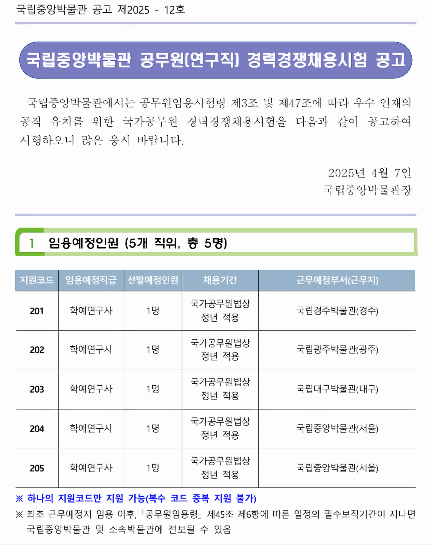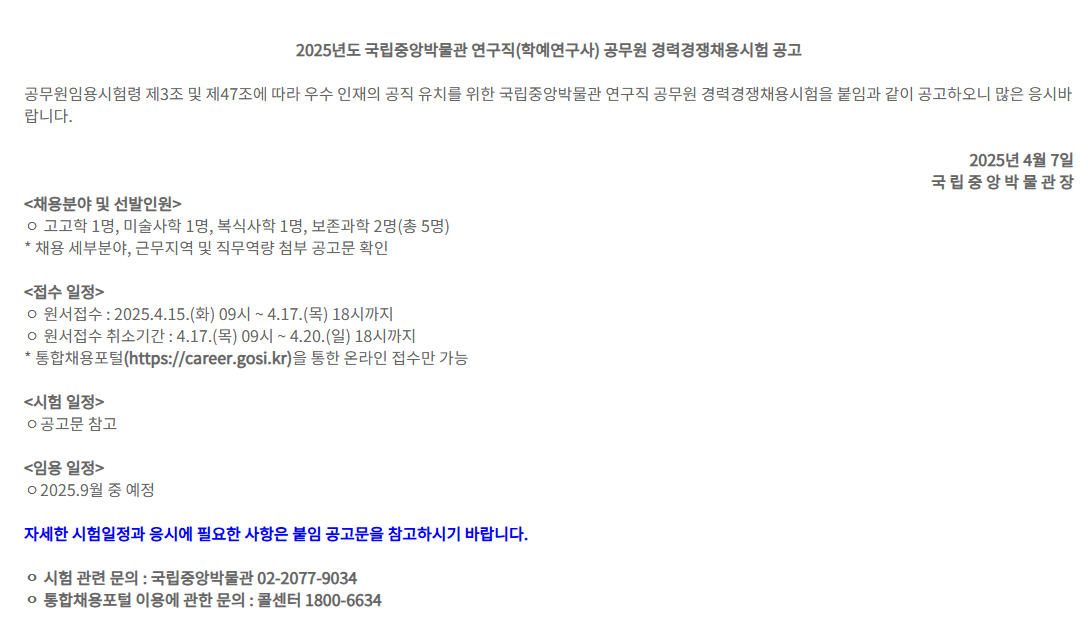 대표적인 국가공무원 학예연구사 채용 기관인 국가유산청과 국립중앙박물관의 2025년도 채용 공고가 모두 올라왔네요.