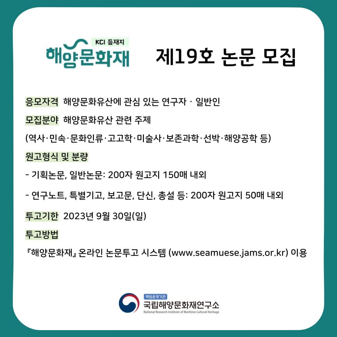 국립해양문화재연구소에서 『해양문화재』 (KCI 등재지) 제19호에 게재할 원고를 모집합니다✨