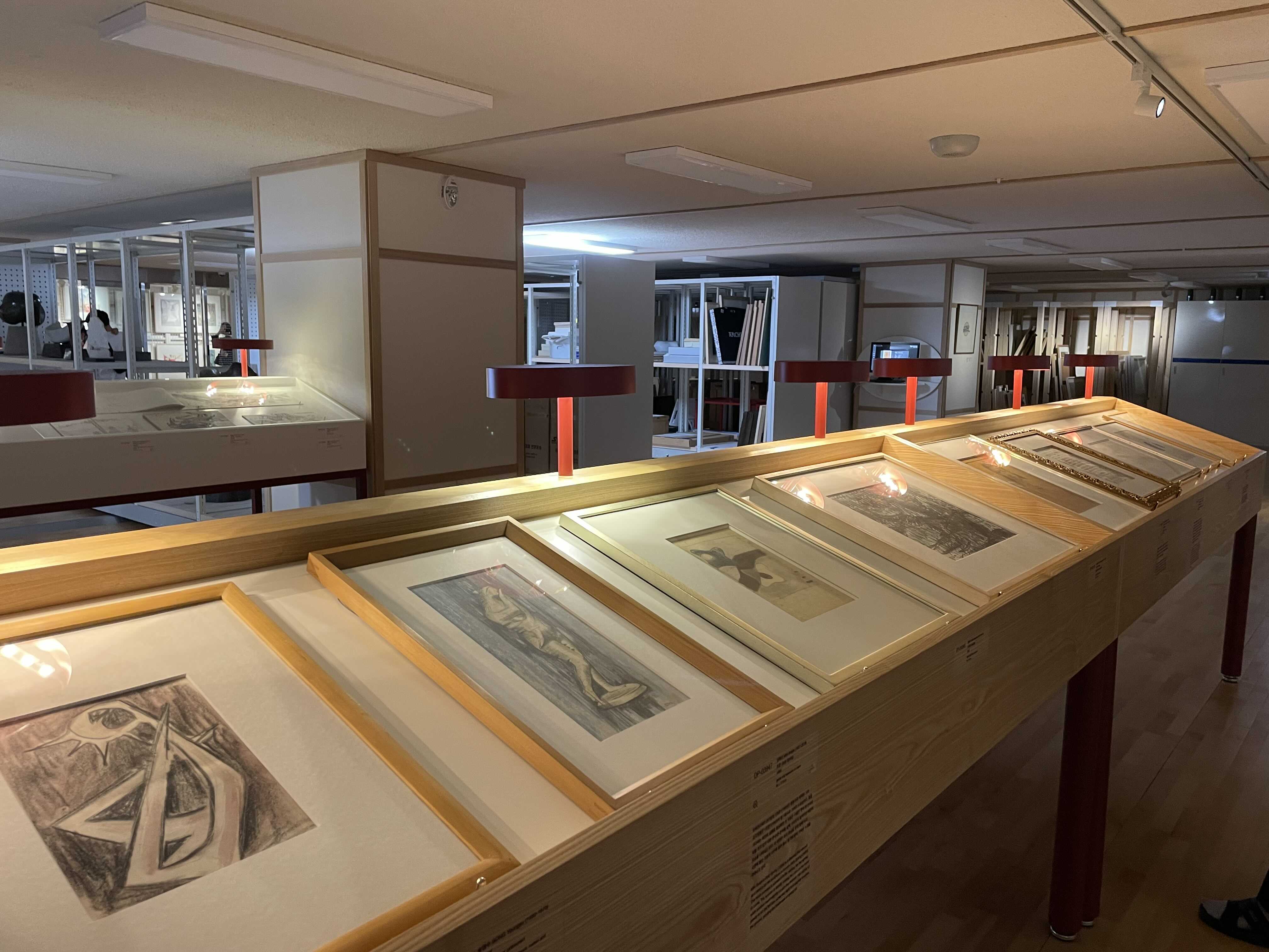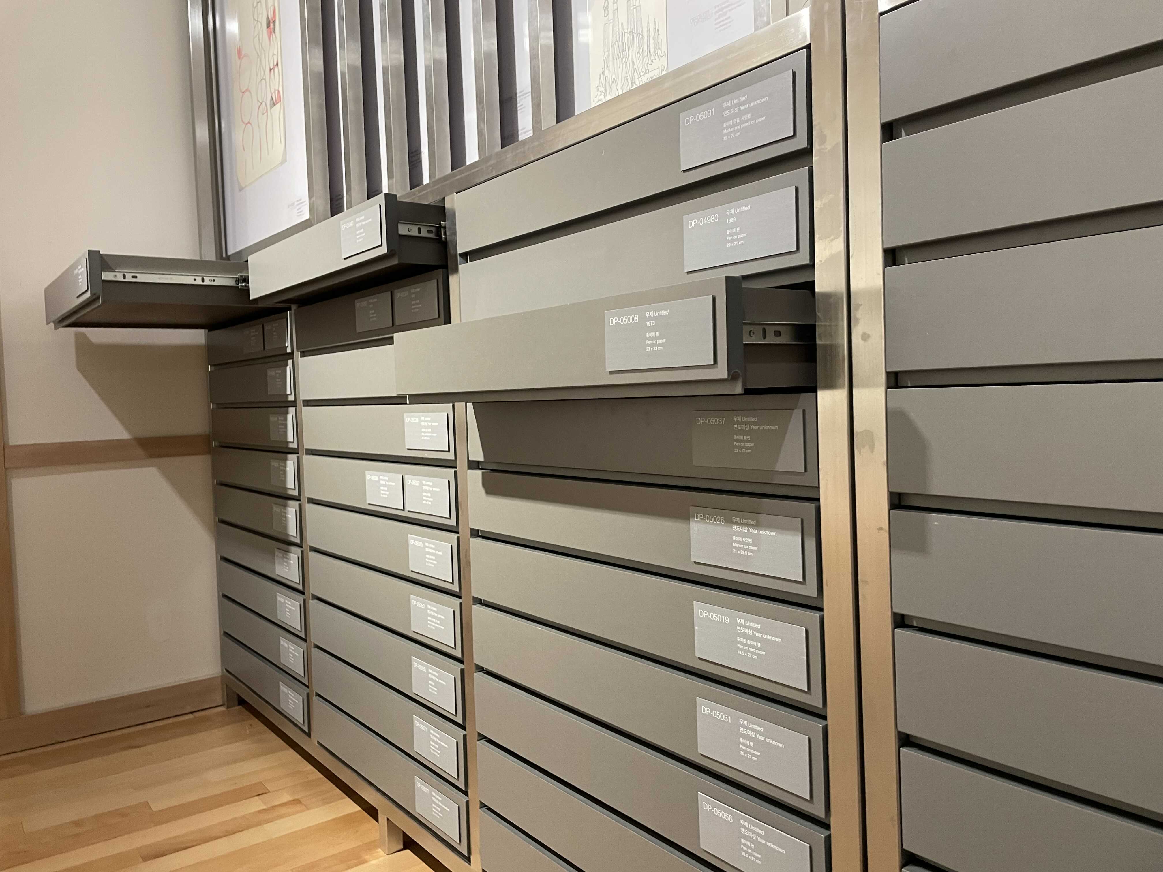 전시 공간이 아닌 이렇게 작품을 수장하고 있는 공간은 조도가 낮습니다. 그림 작품은 조도에 민감하기 때문입니다.