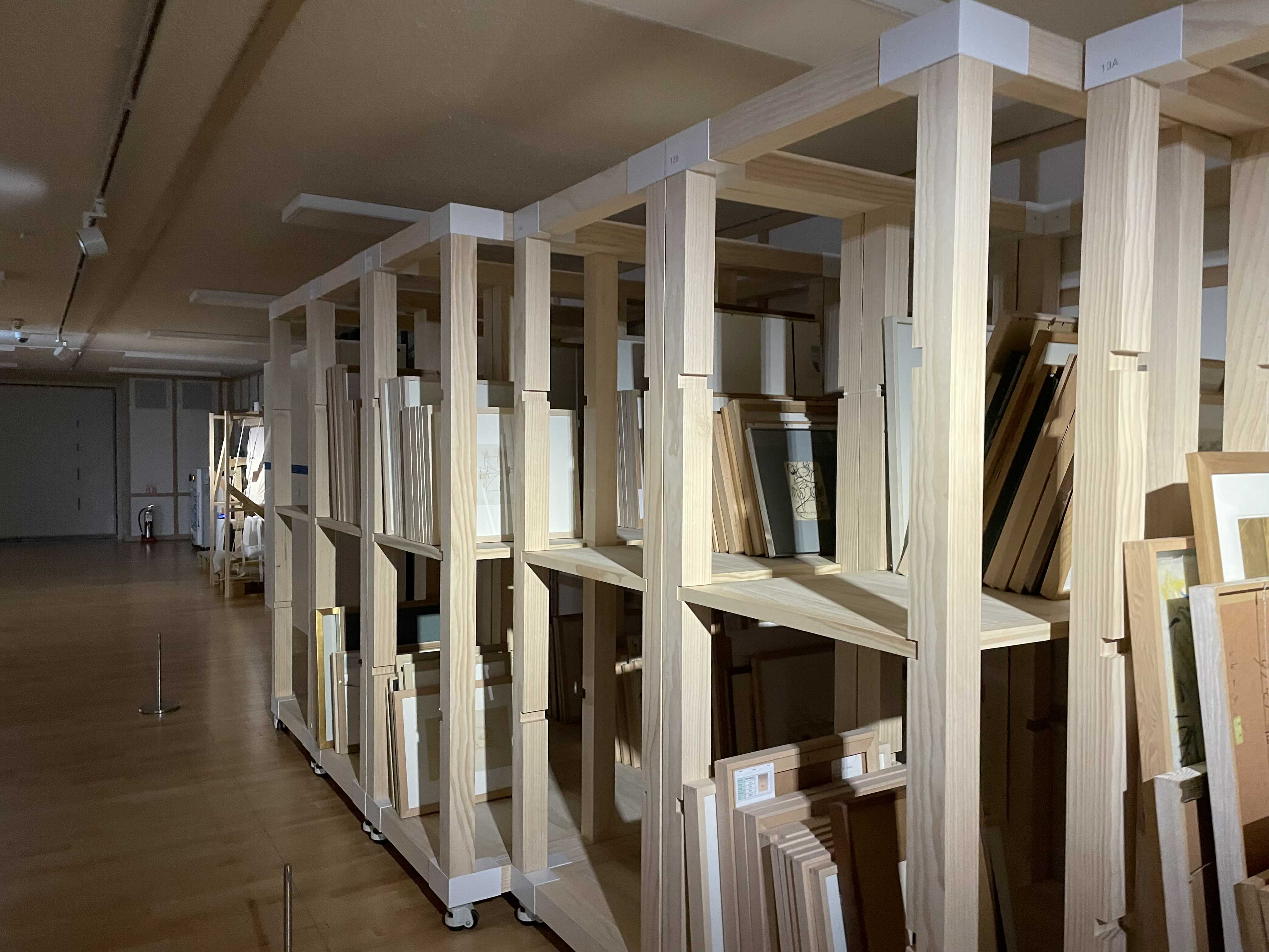 전시 공간이 아닌 이렇게 작품을 수장하고 있는 공간은 조도가 낮습니다. 그림 작품은 조도에 민감하기 때문입니다.