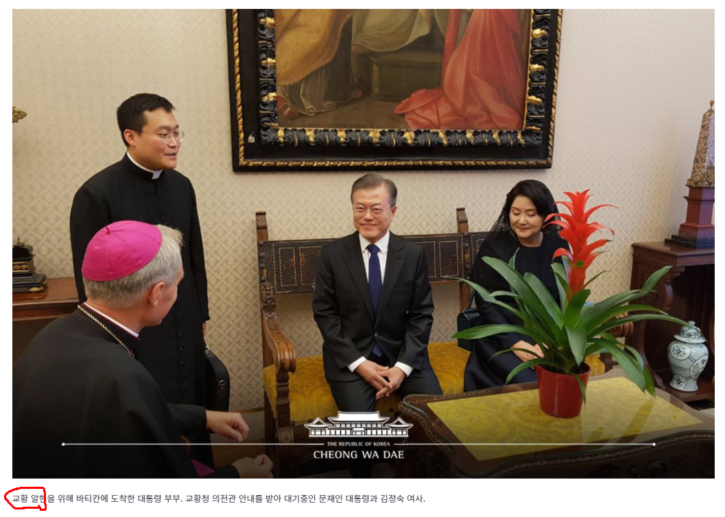 이에서 보듯이 교황을 만난 일을 청와대 스스로가 '알현'이라 표현했음을 본다. 또 실제도 대등한 만남이 아니라 한 수 접고 들어가는 '알현'임을 저 사진은 분명히 보여준다.
