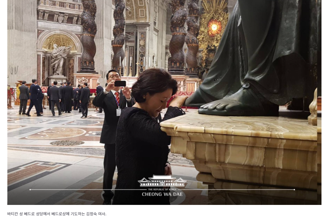 '알현'하기 전인지 이후인지 확실치는 않으나, 그 무렵 김정숙 모습이다. 그래 천주교 신자이니 그럴 수도 있겠다 하겠지만, 문제는 이런 양태들이 심각성을 더한다는 사실이다. 이런 모습들을 불교계가 보지 않았을 리 만무하고 꼭지가 돌고 말았다.