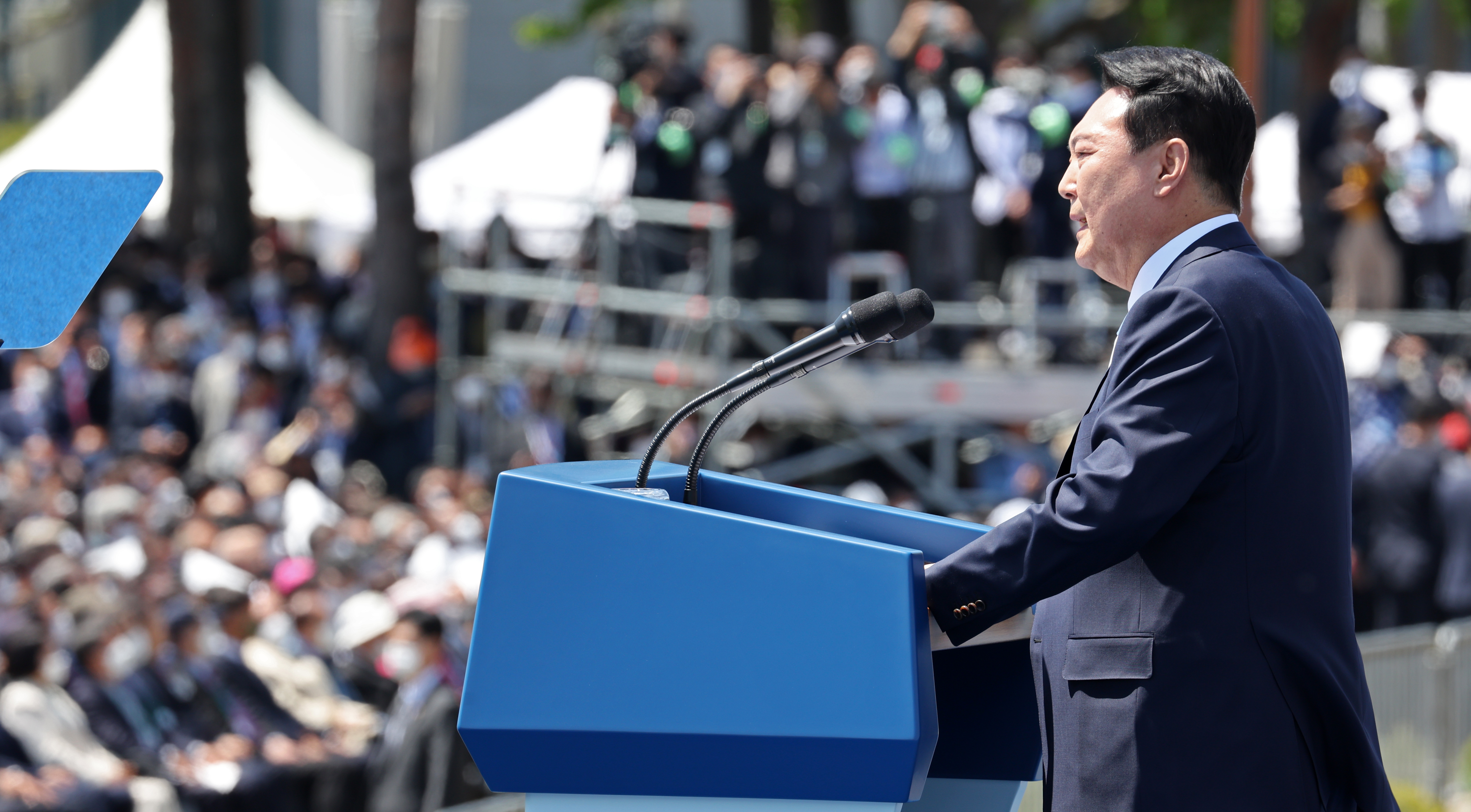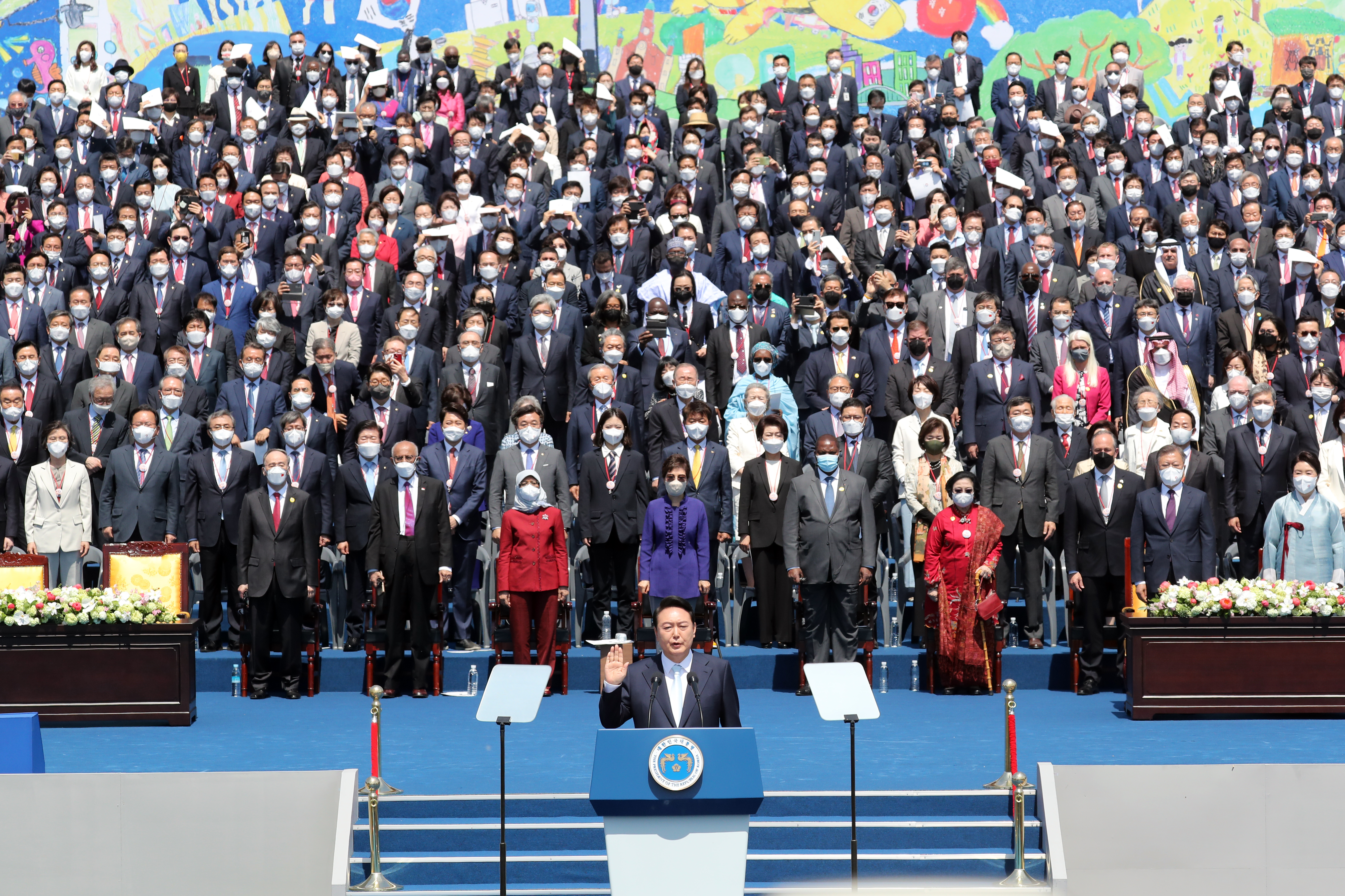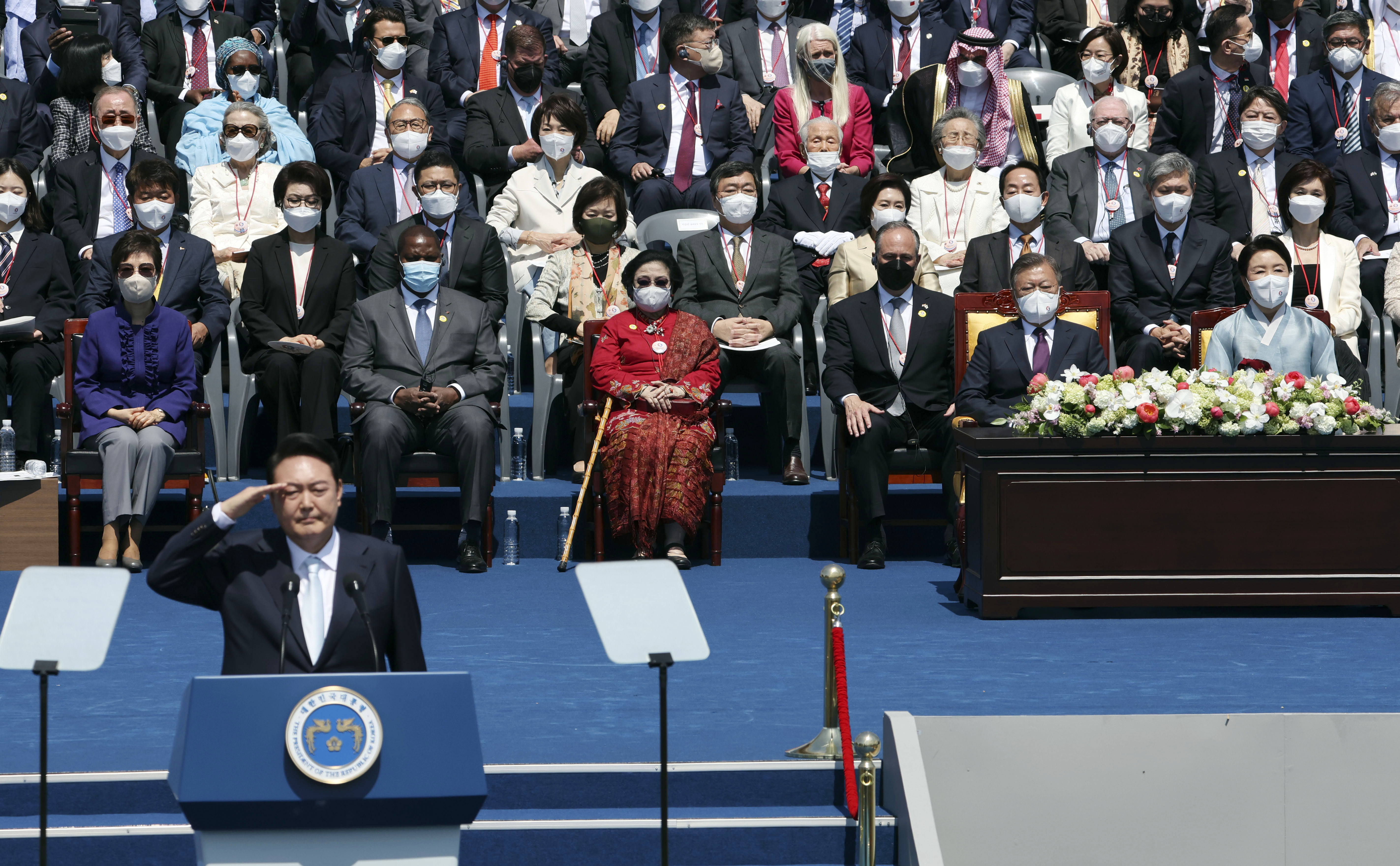 역사적인 자리에 함께 해주신 국민 여러분께 감사드립니다. 문재인, 박근혜 전 대통령, 그리고 할리마 야콥 싱가포르 대통령, 포스탱 아르샹쥬 투아데라 중앙아프리카공화국 대통령, 왕치산 중국 국가부주석, 메가와티 수카르노푸트리 인도네시아 전 대통령, 더글러스 엠호프 해리스 미국 부통령 부군, 조지 퓨리 캐나다 상원의장, 하야시 요시마사 일본 외무상을 비롯한 세계 각국의 경축 사절과 내외 귀빈 여러분께도 깊이 감사드립니다. 이 자리를 빌려 지난 2년간 코로나 펜데믹을 극복하는 과정에서 큰 고통을 감내해주신 국민 여러분께 경의를 표합니다. 그리고 헌신해주신 의료진 여러분께도 감사드립니다.