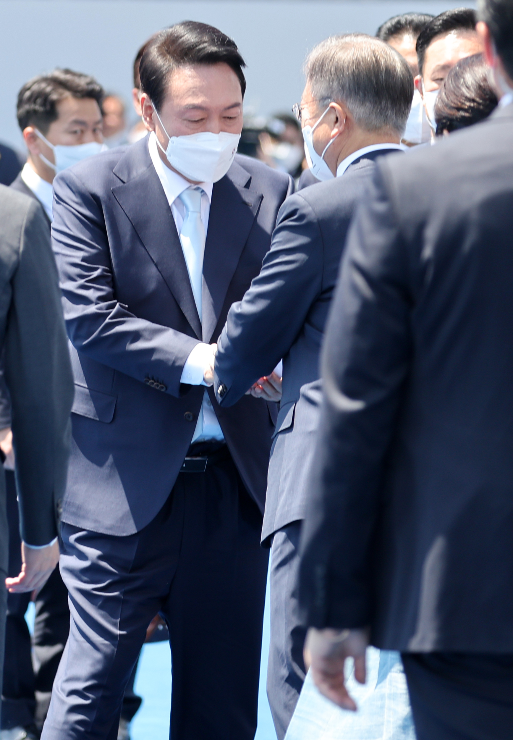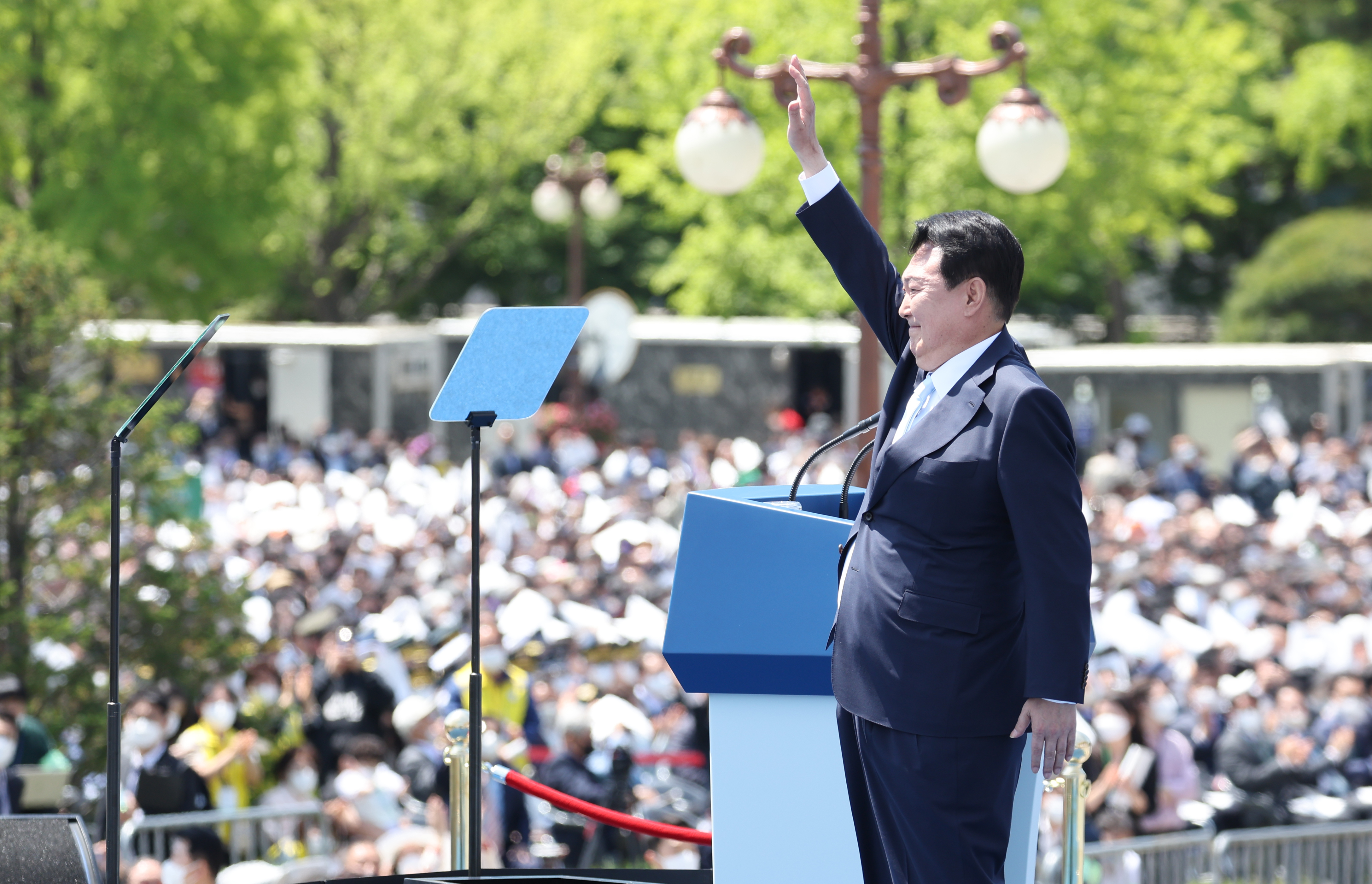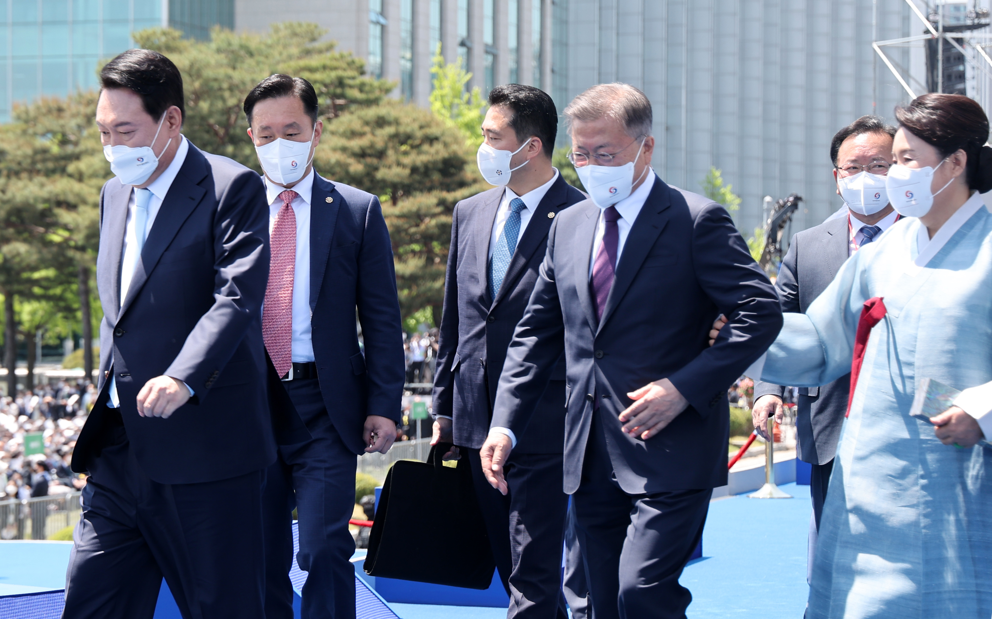 역사적인 자리에 함께 해주신 국민 여러분께 감사드립니다. 문재인, 박근혜 전 대통령, 그리고 할리마 야콥 싱가포르 대통령, 포스탱 아르샹쥬 투아데라 중앙아프리카공화국 대통령, 왕치산 중국 국가부주석, 메가와티 수카르노푸트리 인도네시아 전 대통령, 더글러스 엠호프 해리스 미국 부통령 부군, 조지 퓨리 캐나다 상원의장, 하야시 요시마사 일본 외무상을 비롯한 세계 각국의 경축 사절과 내외 귀빈 여러분께도 깊이 감사드립니다. 이 자리를 빌려 지난 2년간 코로나 펜데믹을 극복하는 과정에서 큰 고통을 감내해주신 국민 여러분께 경의를 표합니다. 그리고 헌신해주신 의료진 여러분께도 감사드립니다.