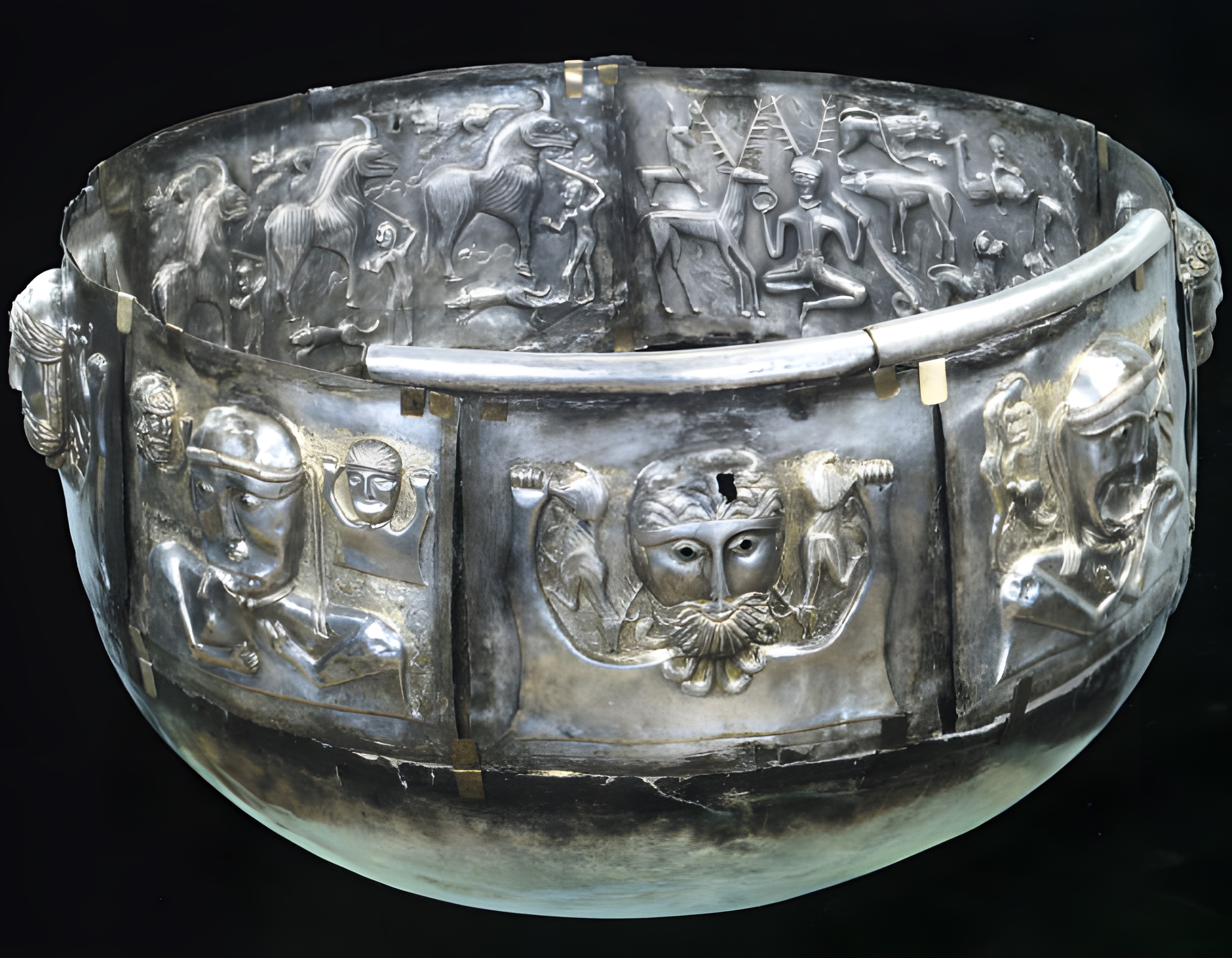 간략 설명 : 유럽 철기 시대 은세공품으로 가장 크다고 알려졌다. 지름 69cm, 높이 42cm이며 무게는 거의 9kg다.