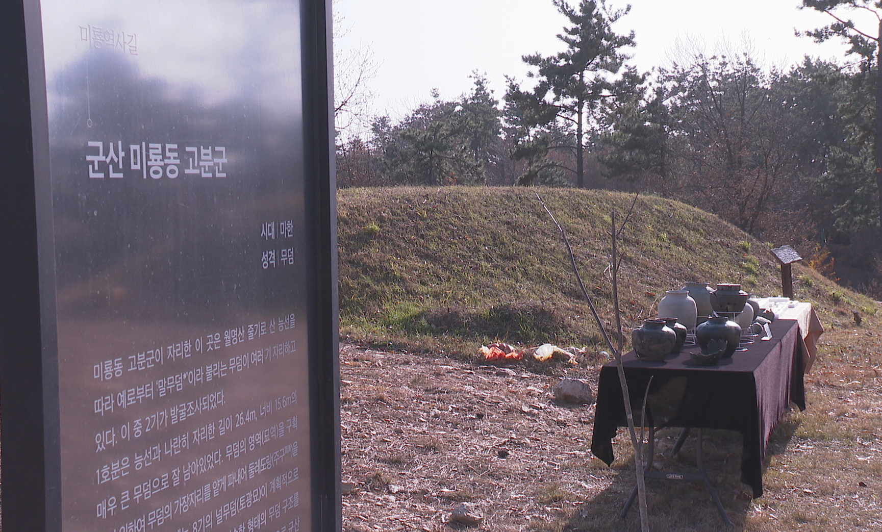 아무튼 이에 의해 군산시 서쪽을 남-북 방향으로 관통하는 월명산 산줄기 해발 40~45m 능선을 따라 집터와 함께 자리를 잡은 이 미룡동 고분군을 2023년 시굴 및 발굴조사를 한 결과 마한계 토광묘 17기, 옹관묘 7기, 주거지 7기가 드러났는가 하면, 한성백제와 마한의 관계를 조명할 수 있는 흑색마연토기 및 지도자급 위세품인 소환두대도, 곡옥 등이 발굴됐다고 한다.