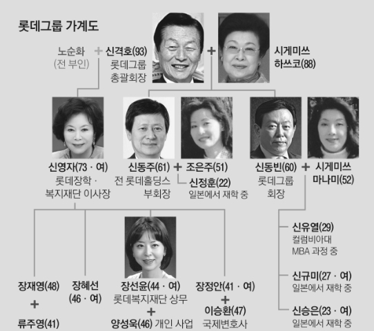 한국말도 서투르다. 일본에서 태어나 그곳에서 자랐으며 한국으로 귀국한 후에는 국적을 백프로 한국으로 바꾸고 한국기업주로 살고 있다. 아래 롯데그룹 가계도를 보면 간단치 않다.