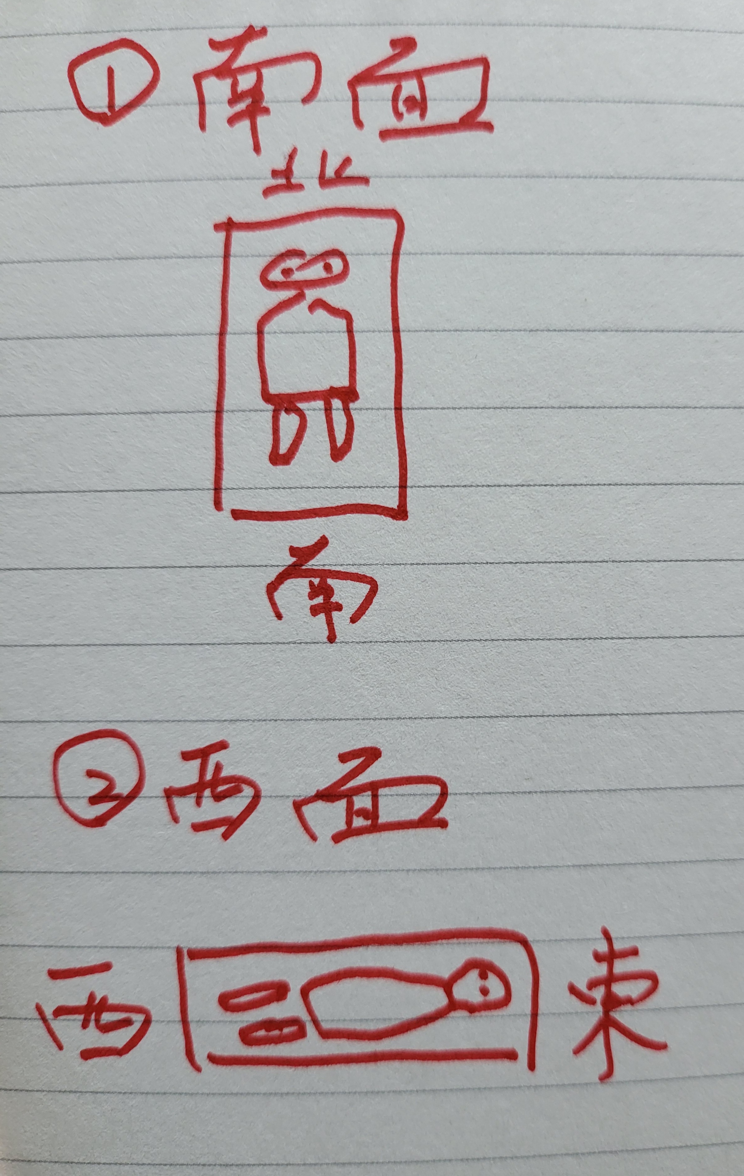 결국 길쭉한 사람을 매장할 적에 어느 방향으로 시체를 두는가, 또 머리는 어느쪽을 향하는가 하는 문제이니