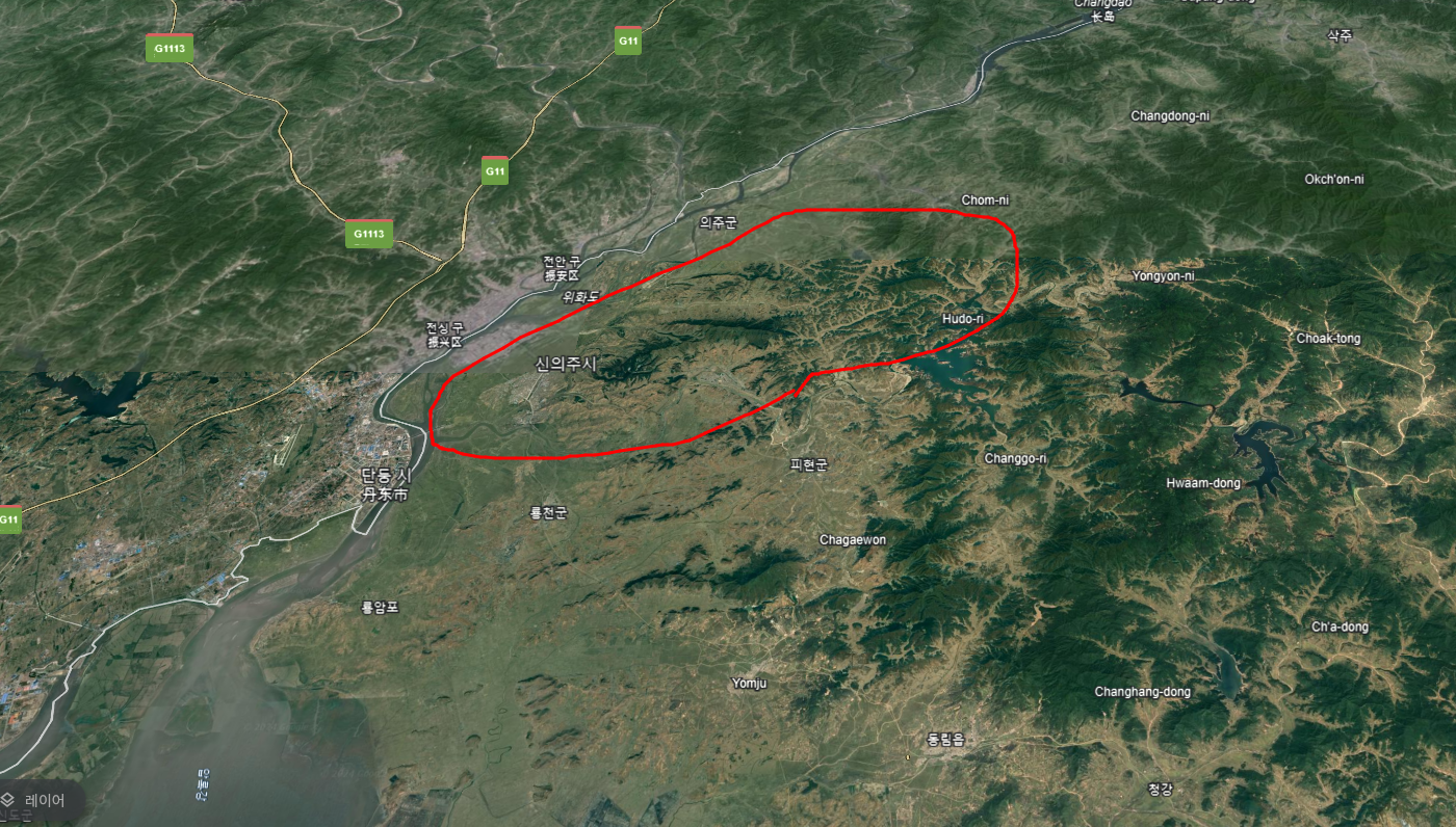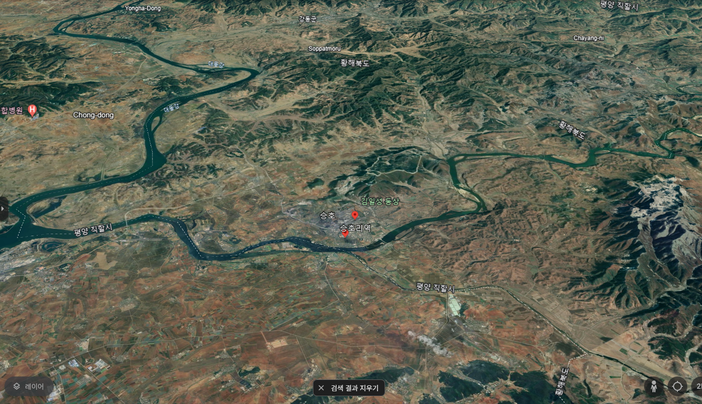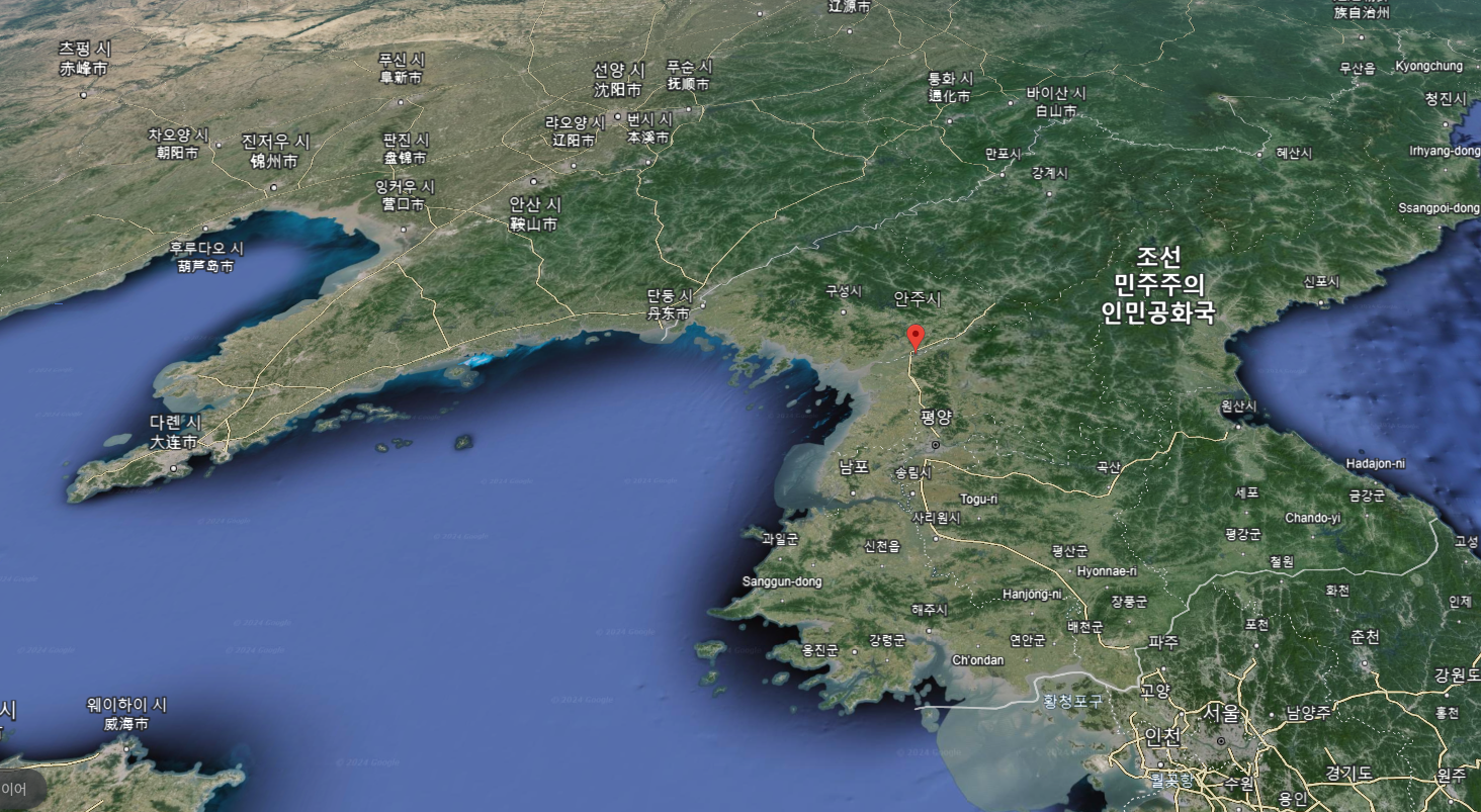 이 대목을 보면 고려군 본진은 영주에 주둔했음을 본다. 이곳이 지금의 평안남도 안주라는데 구글어스에서 그 지점을 찍으면 다음과 같다.