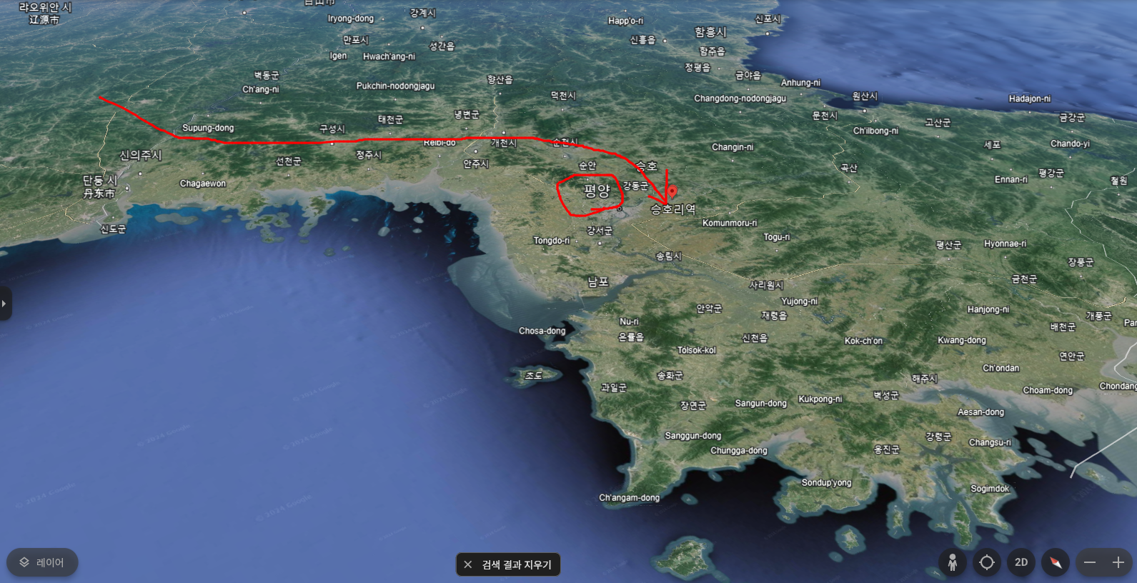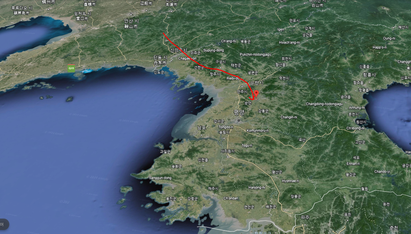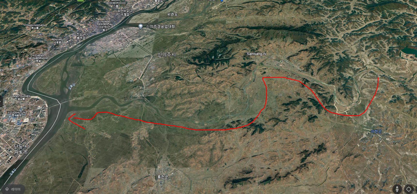 이 대목을 보면 고려군 본진은 영주에 주둔했음을 본다. 이곳이 지금의 평안남도 안주라는데 구글어스에서 그 지점을 찍으면 다음과 같다.