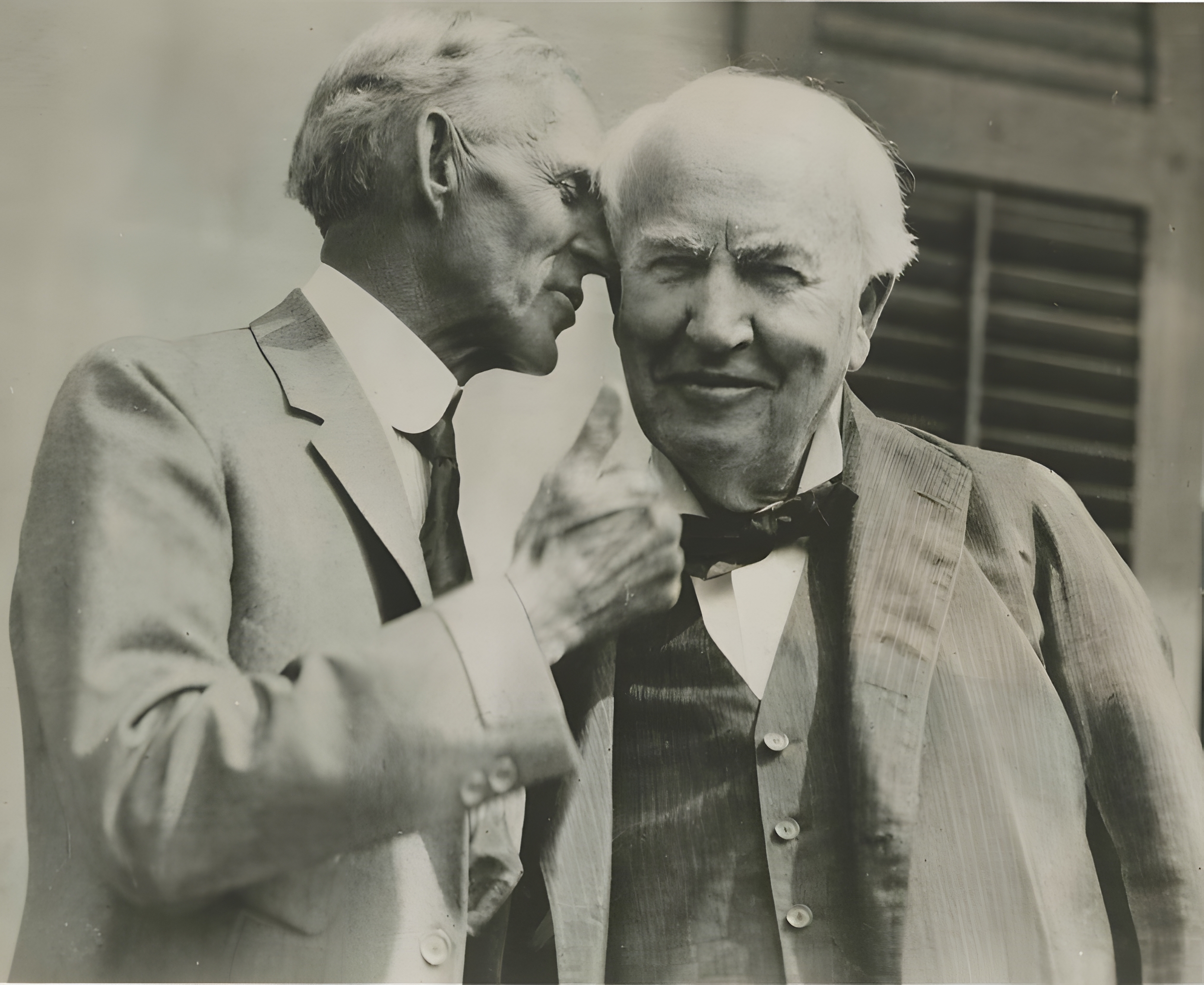1925년에 찍은 이 사진은 포드가 에디슨에게 무언가를 속삭이는 것처럼 보이지만, 현실은 그 반대였다.