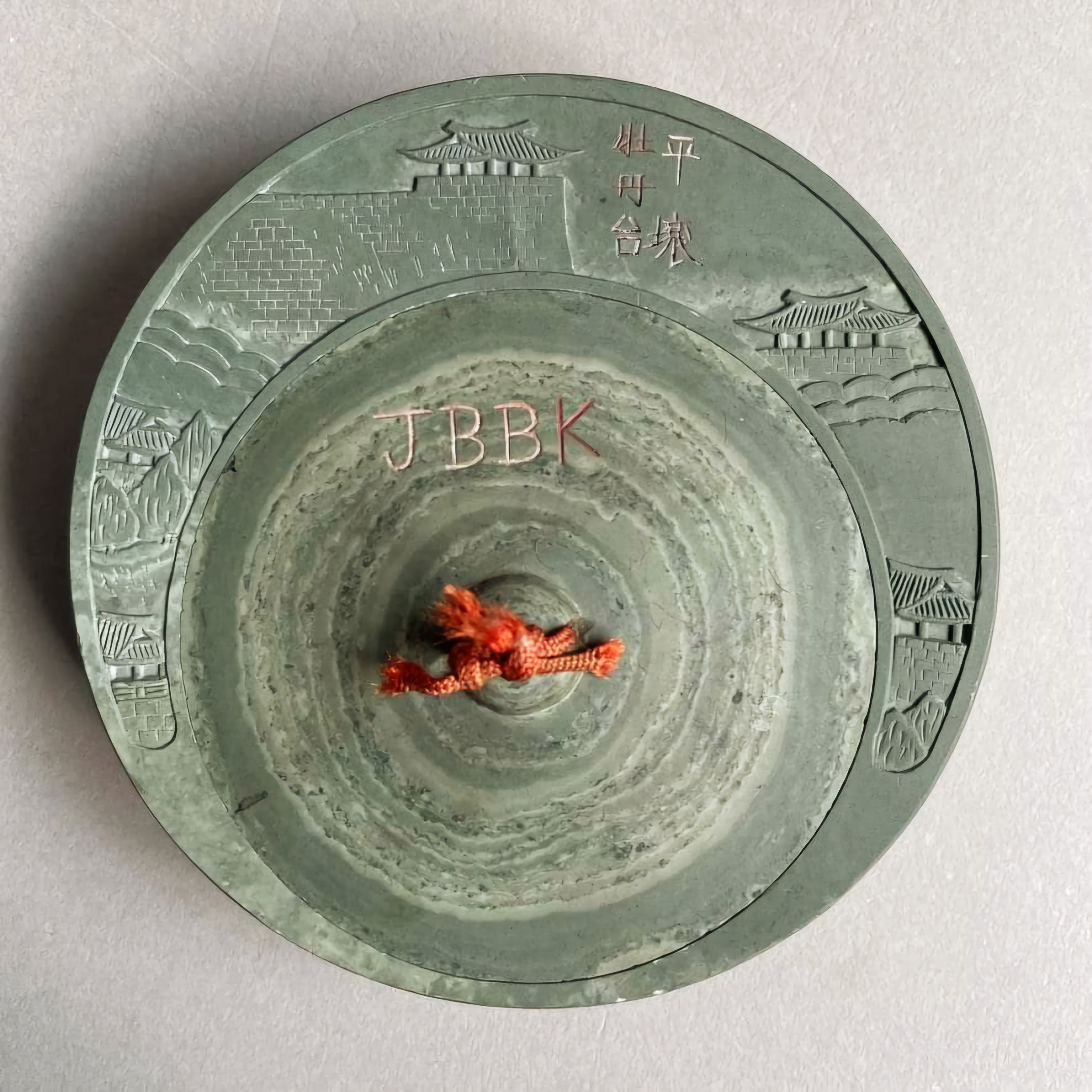 거기 뚜껑을 얹었는데, 그 위쪽에 평양 경승 모란대를 새겼고 그 주위 대동강과 평양 풍경 약간을 채워넣었다.