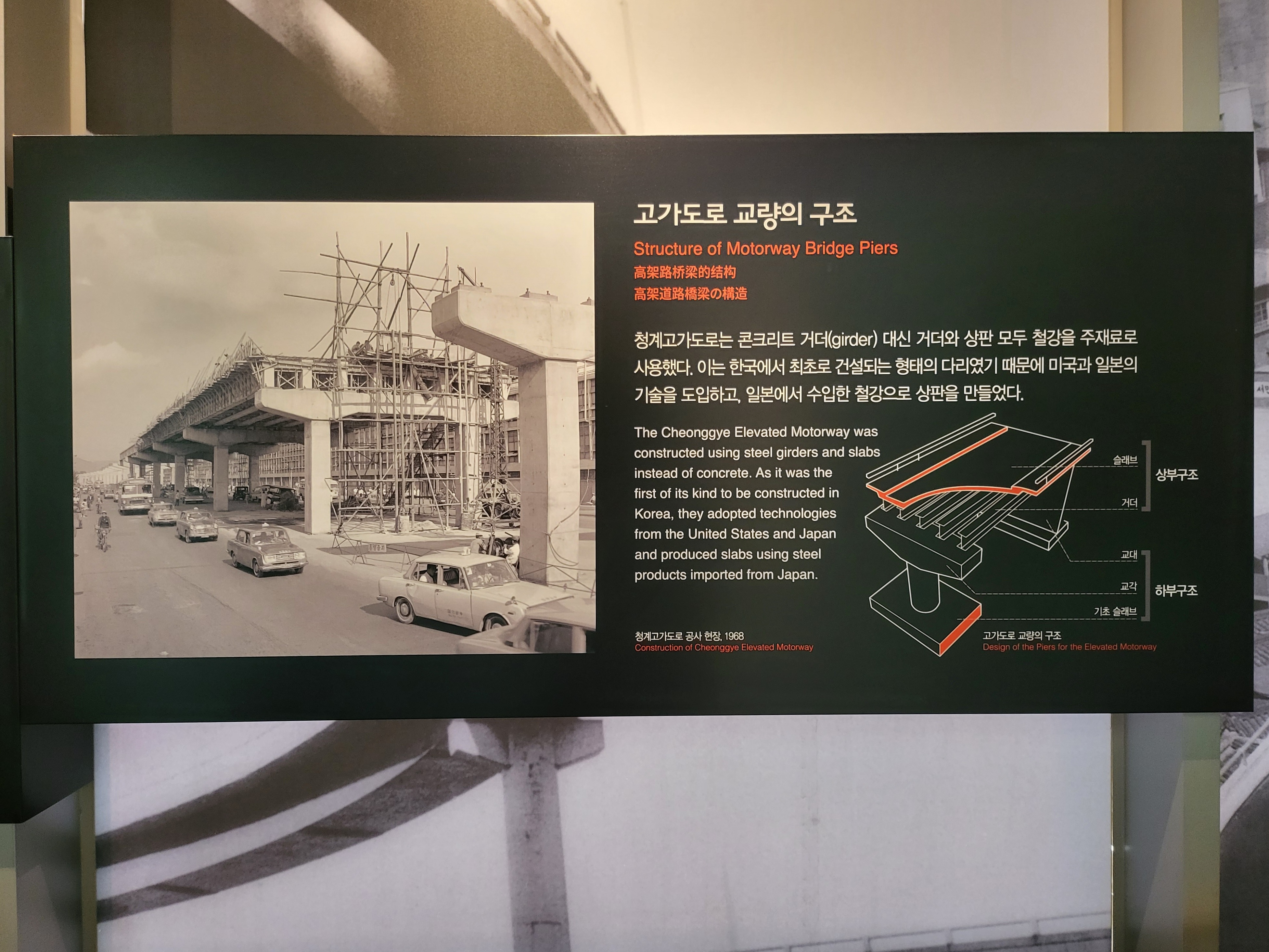 청계고가도로는 콘크리트 거데(girder) 대신 거더와 상판 모두 철강을 주재료로 사용했다.
