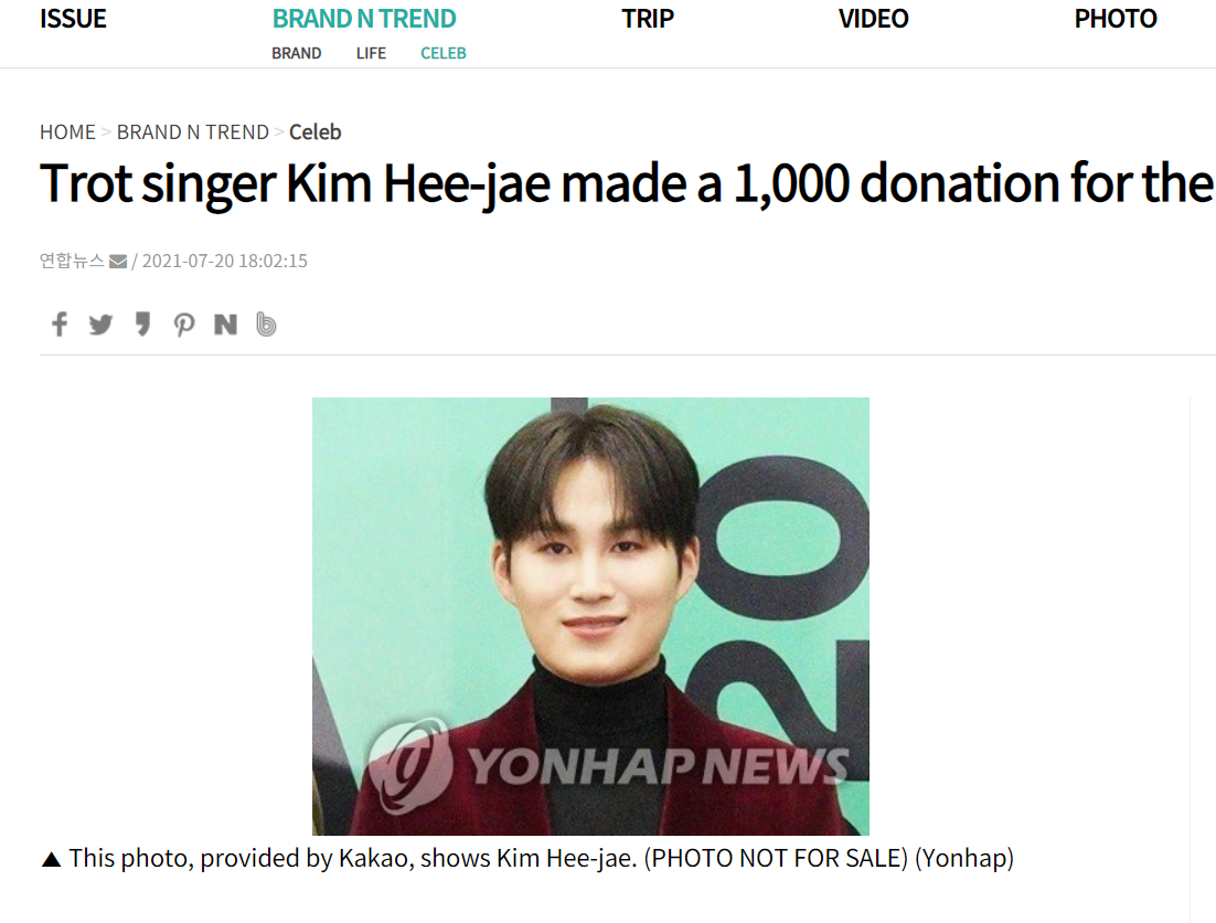 This photo, provided by Kakao, shows Kim Hee-jae. (PHOTO NOT FOR SALE) (Yonhap) SEOUL, July 20 (Yonhap) -- Trot singer Kim Hee-jae, who served as a navy soldier in his military days, donated 1,000 f ...