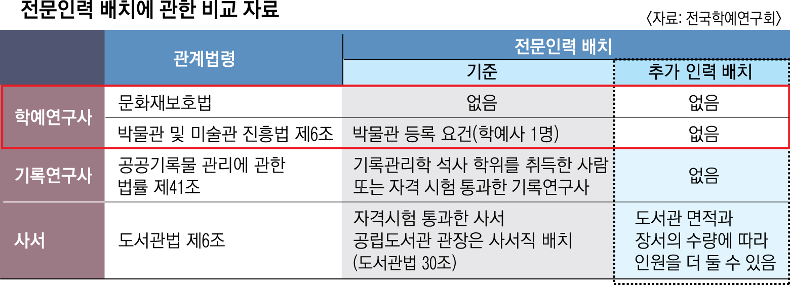 지자체 학예연구직 인력이 지역별로 제각각인 이유는 관계법령이 미비한 탓이 크다. 현재 학예연구직 배치에 관한 법은 ‘박물관 및 미술관 진흥법 제6조’로, 지자체에 등록된 공립박물관은 학예연구사를 1명 이상 두게 돼 있다. 하지만 지자체 문화재 업무 학예연구사 배치에 관한 법 규정은 따로 없다 보니 지자체장의 관심과 의지에 따라 학예연구사 지위와 처우가 천차만별이라는 게 연구회의 주장이다.