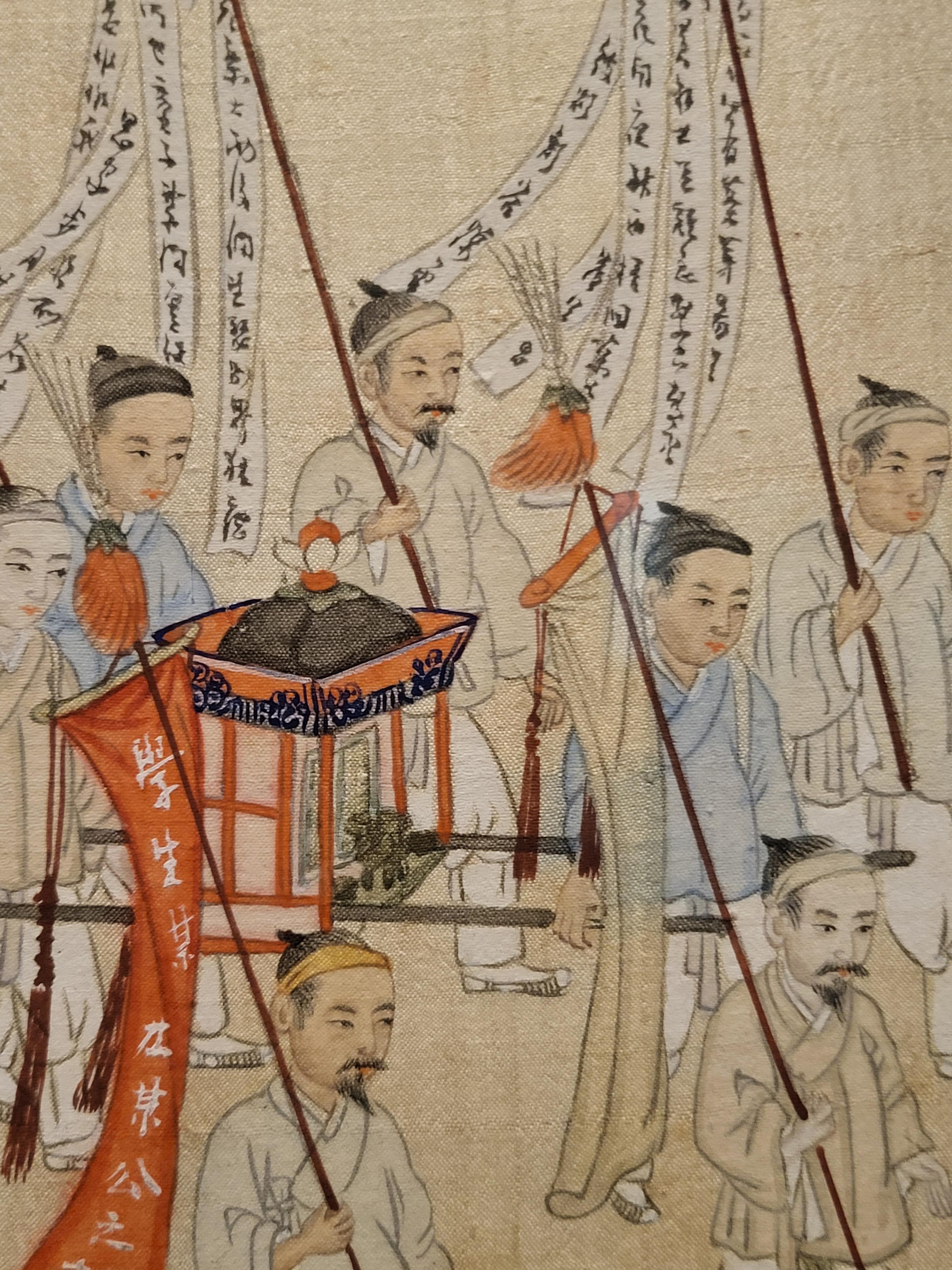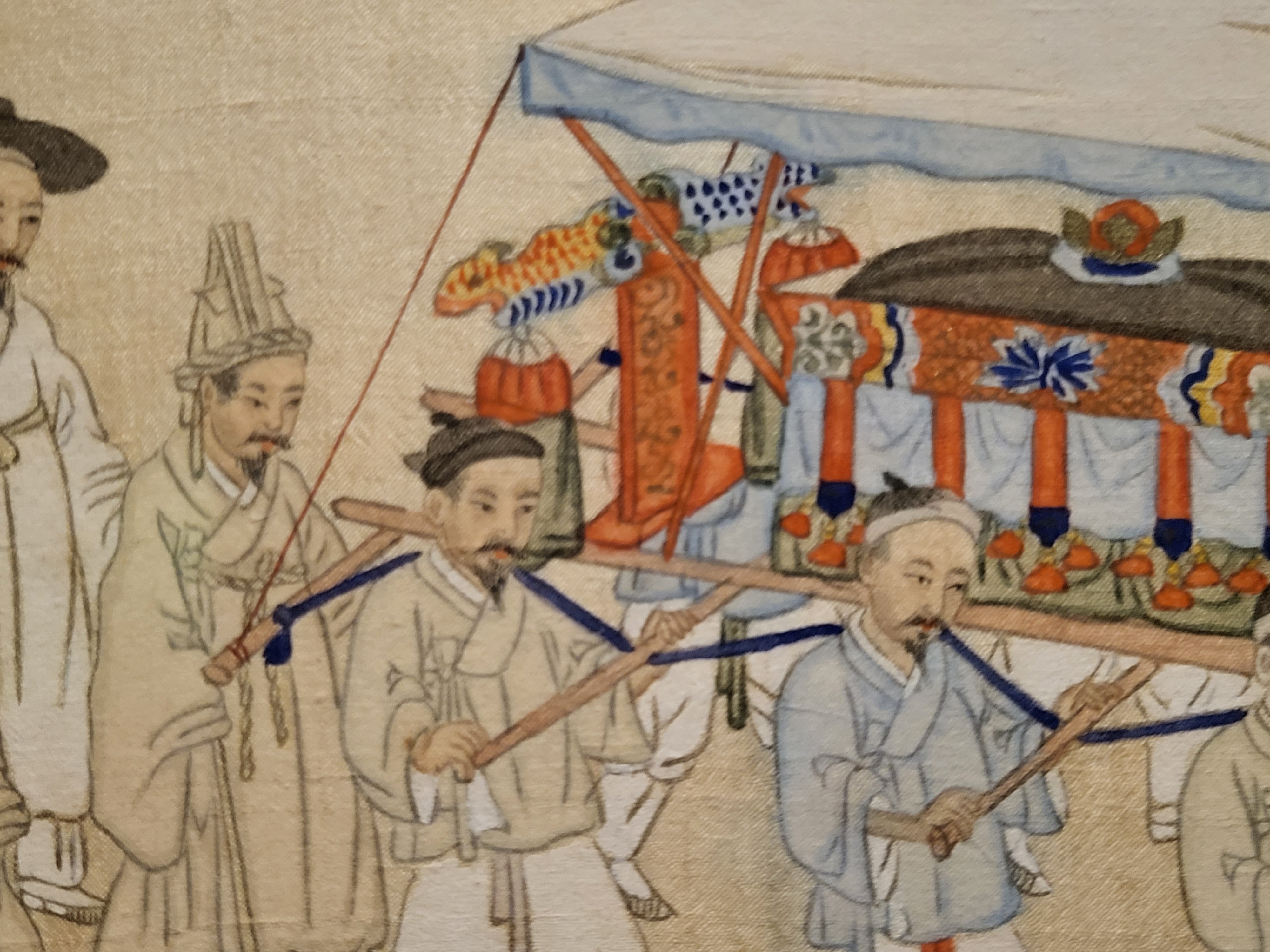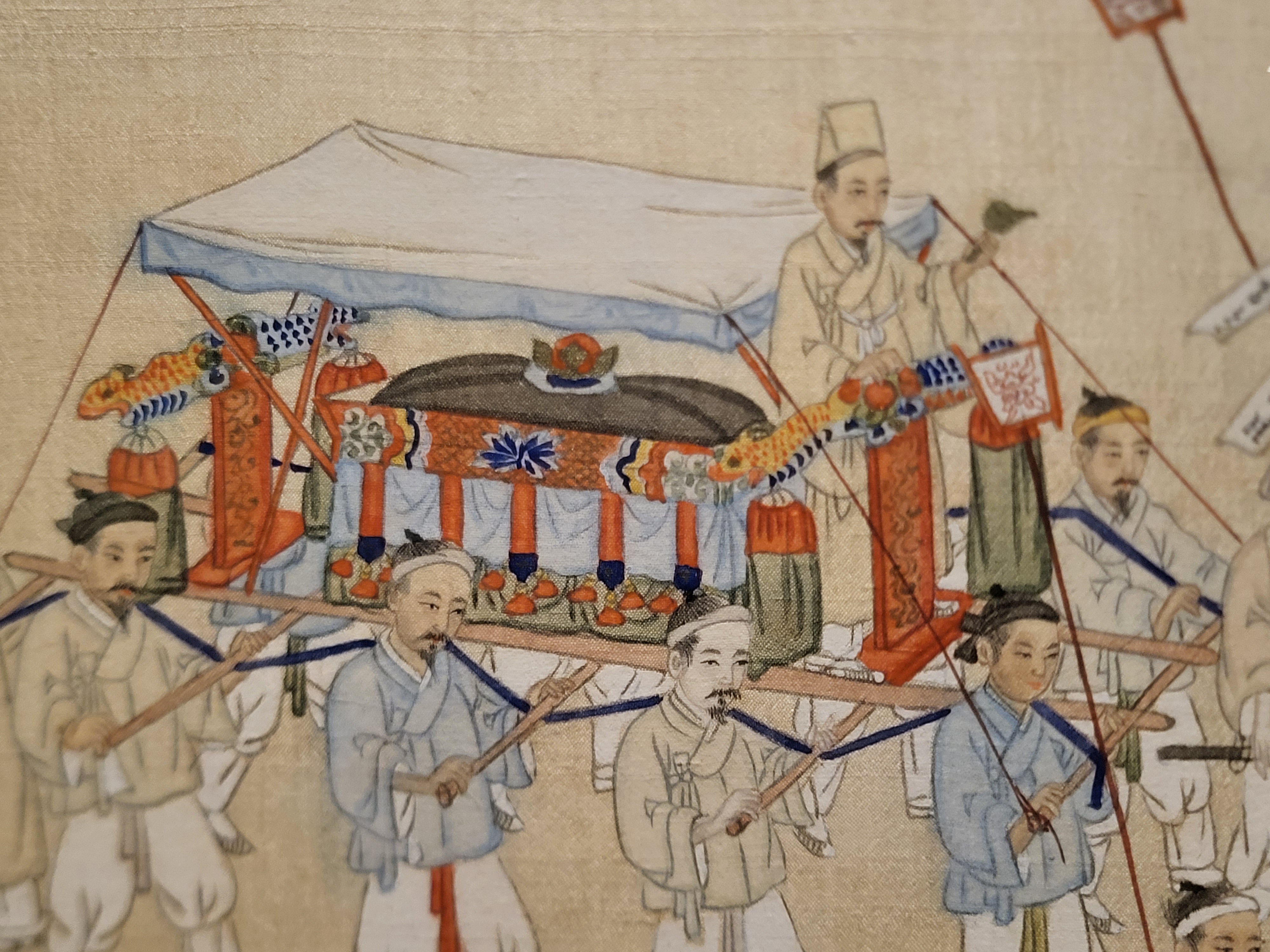 People and procession objects are sequentially depicted, induding myeongjeong (a funeral banner), gongpo (a hemp cloth banner), yoyeo (funeral elegy), wunsab (signs carried at the front and back of the funeral procession), asab (a ritual tool), sangyeo (bier), sangju (family of the deceased), and bingaek (funeral guests).