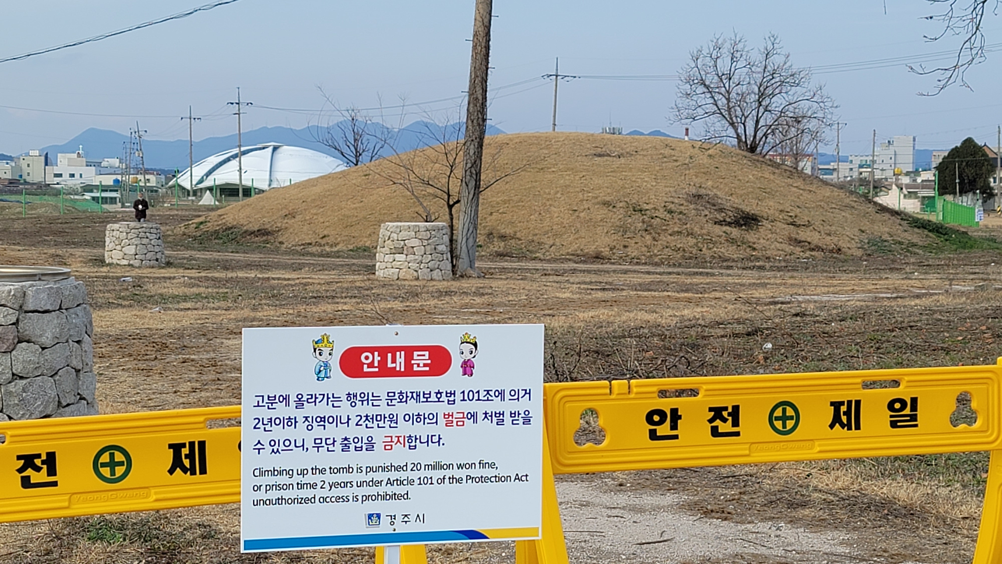 Unauthorized entry to the burial mound is prohibited as it may be punished by imprisonment for up to two years or a fine of up to 20 million won in accordance with Article 101 of the Cultural Heritage Protection Act.