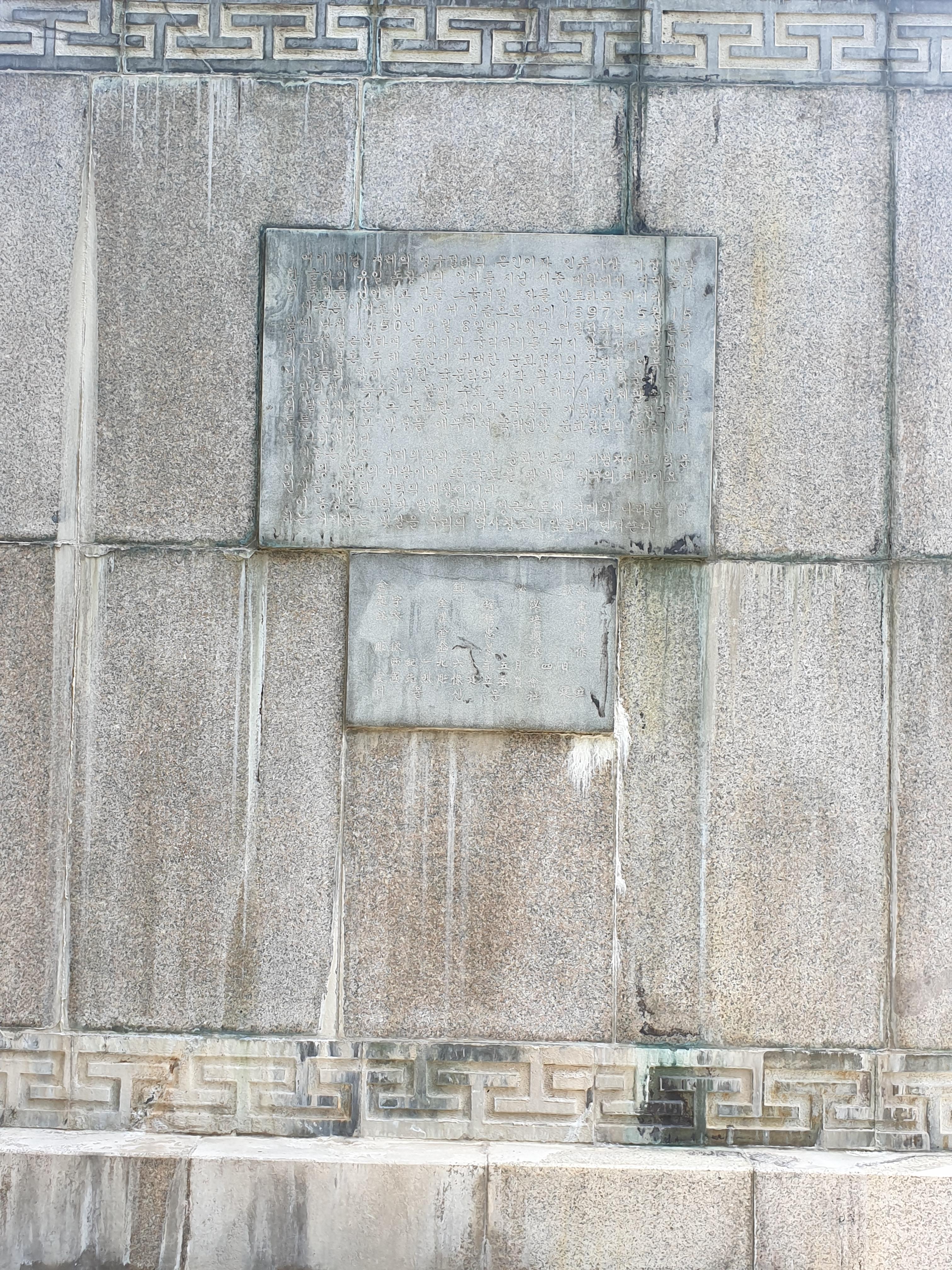 여기 배달 겨레의 영구절대의 은인이자 인류사상 가장 발달한 글자의 유일 독창자의 영예를 지닌 세종대왕께서 겨레문화의 독립을 선언하고 한글 스물여덟 자를 반포하고 계시다. 세종은 이씨조선 네째 뉘 임금으로 서기 1397년 5월 15일에 나셔 1450년 4월 8일에 가셨다. 어릴적부터 총명돈독하고 성실근면하여 글읽기와 궁리하기를 쉬지 않으셨다.