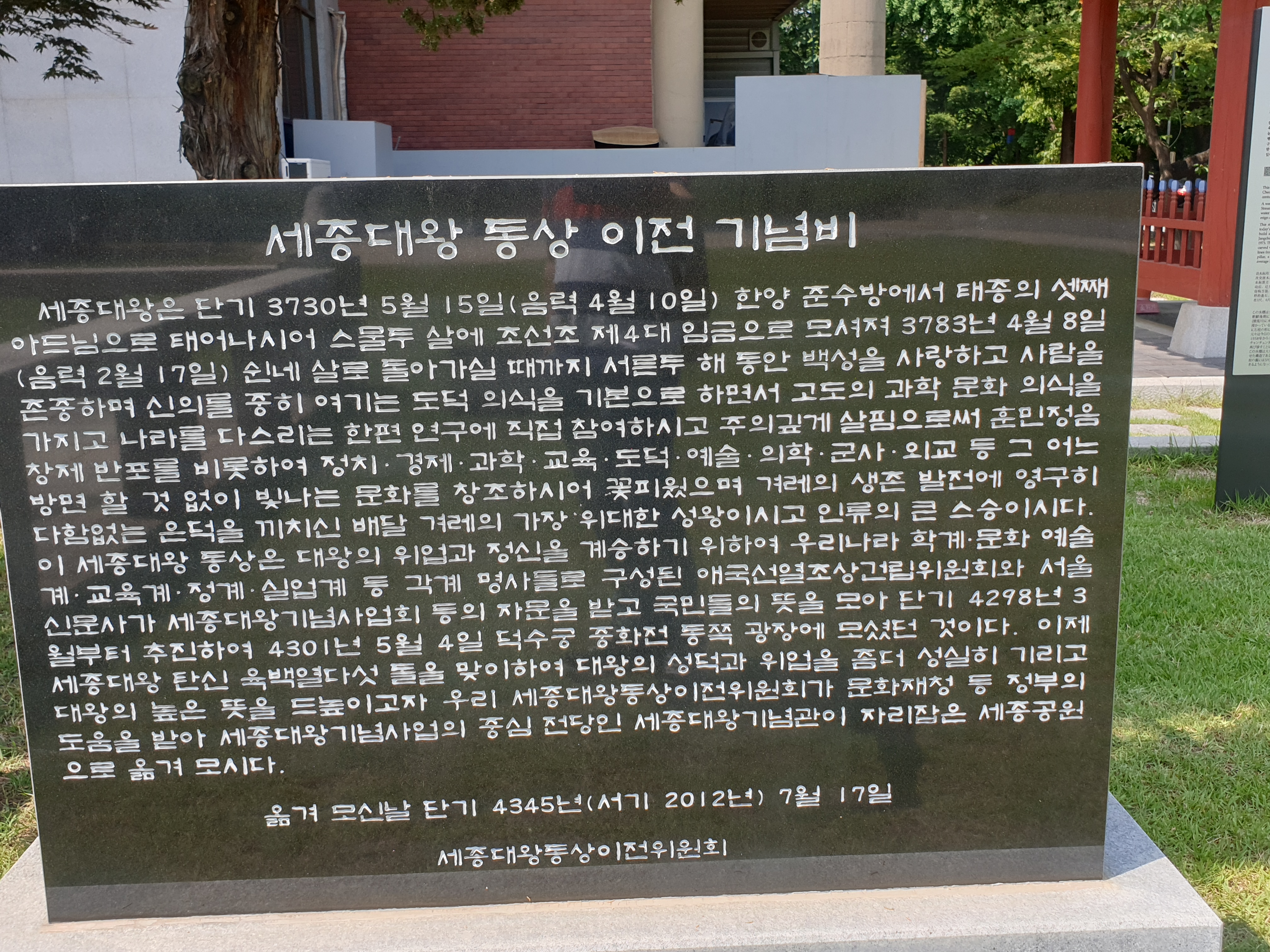 이제 세종대왕 탄신 육백열다섯 돌을 맞이하여 대왕의 성덕과 위업을 좀 더 성실히 기리고 대왕의 높은 뜻을 드높이고자 우리 세종대왕 동상위원회가 문화재청 등 정부의 도움을 받아 세종대왕기념사업의 중심 전당인 세종대왕기념관이 자리잡은 세종공원원으로 옮겨 보이다.