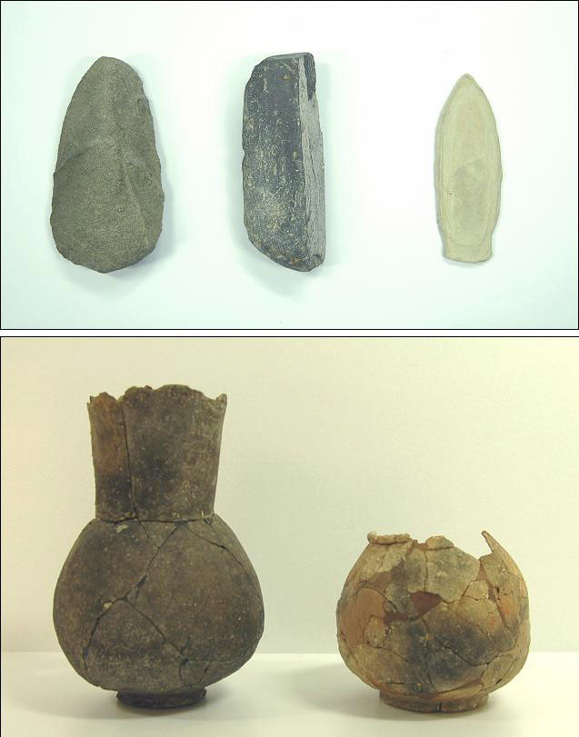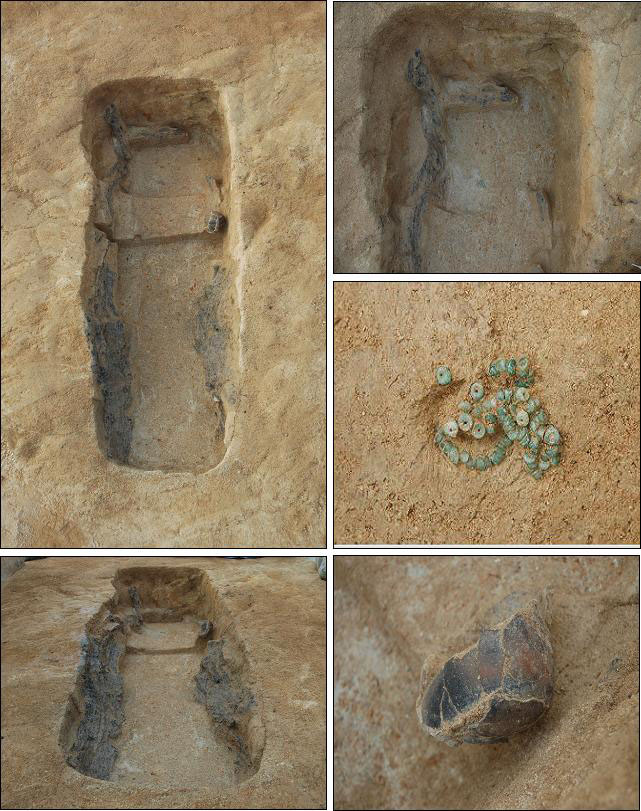 출토유물로는 흑도장경호(검은빛이 도는 목이 긴 항아리), 주머니호, 천하석제 소옥(小玉) 100여 점, 자루 갖춤 돌칼을 비롯한 석기류 3점이 확인됐다.