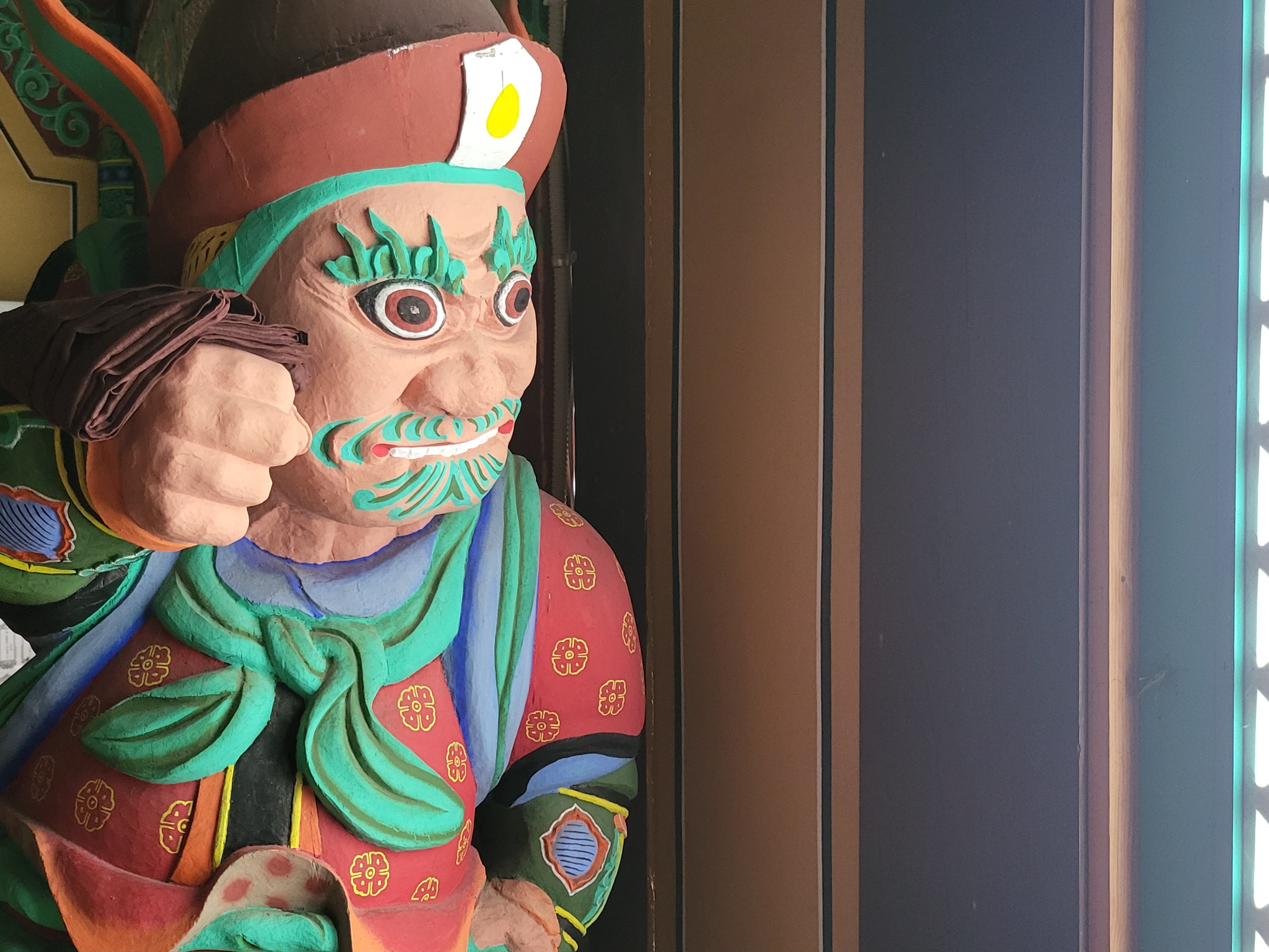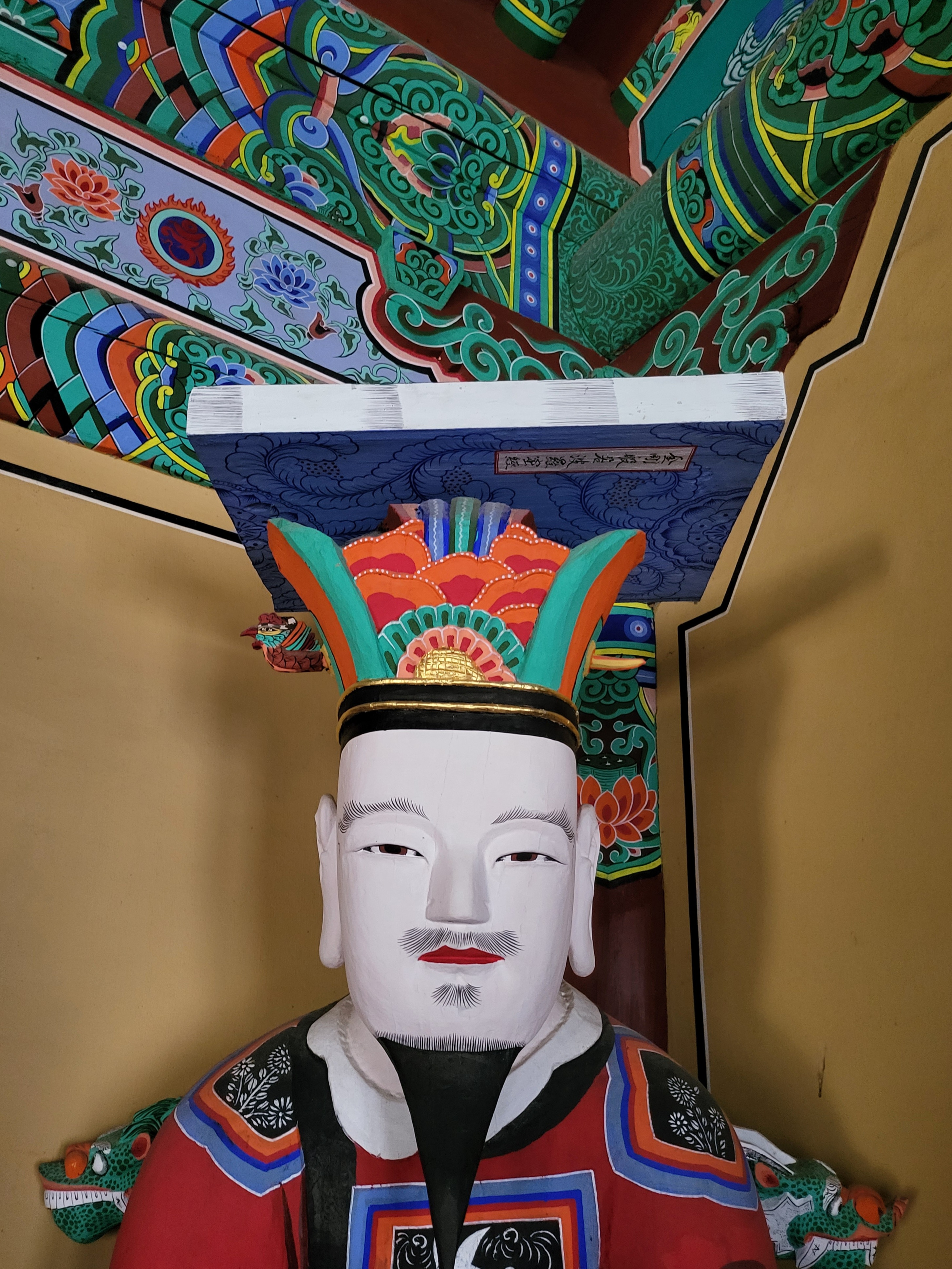 Demon King Wudu is believed to expel evil from people's hearts. He is depicted wearing a headdress and holding