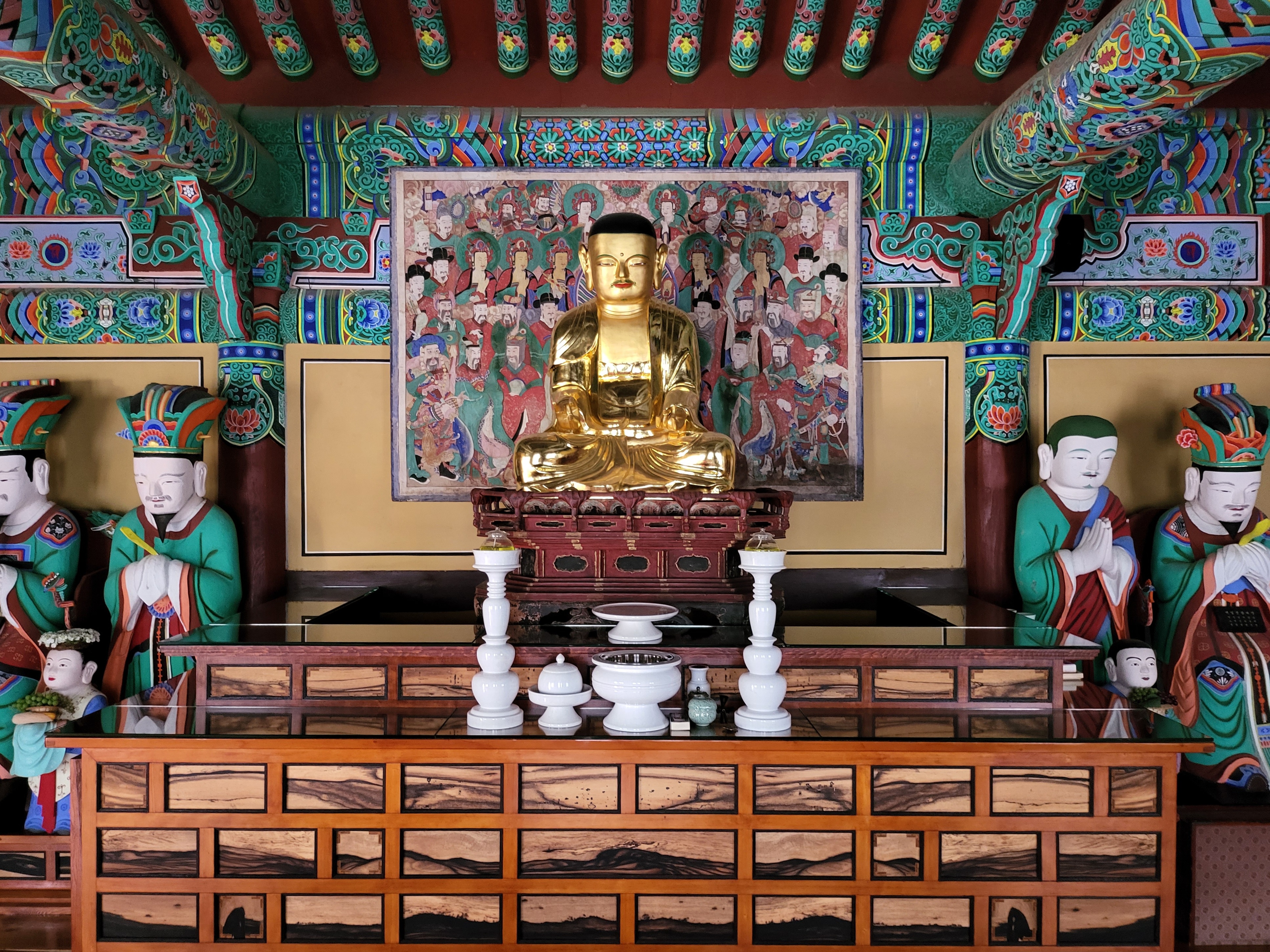 불단 양옆에는 저승에서 죽은 자의 죄를 심판하는 10명의 재판관인 시왕十王, 시왕의 재판을 보조하는 판관, 실무 관리인 녹사의 상이 배치되어 있고, 양쪽 끝에는 불교의 수호신인 인왕상이 서 있다.