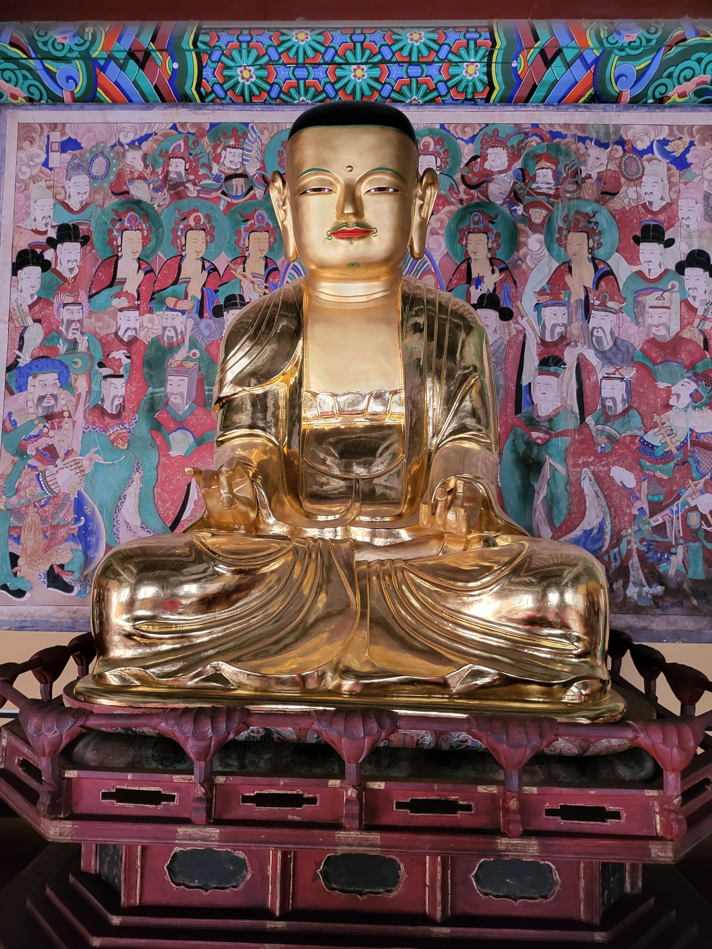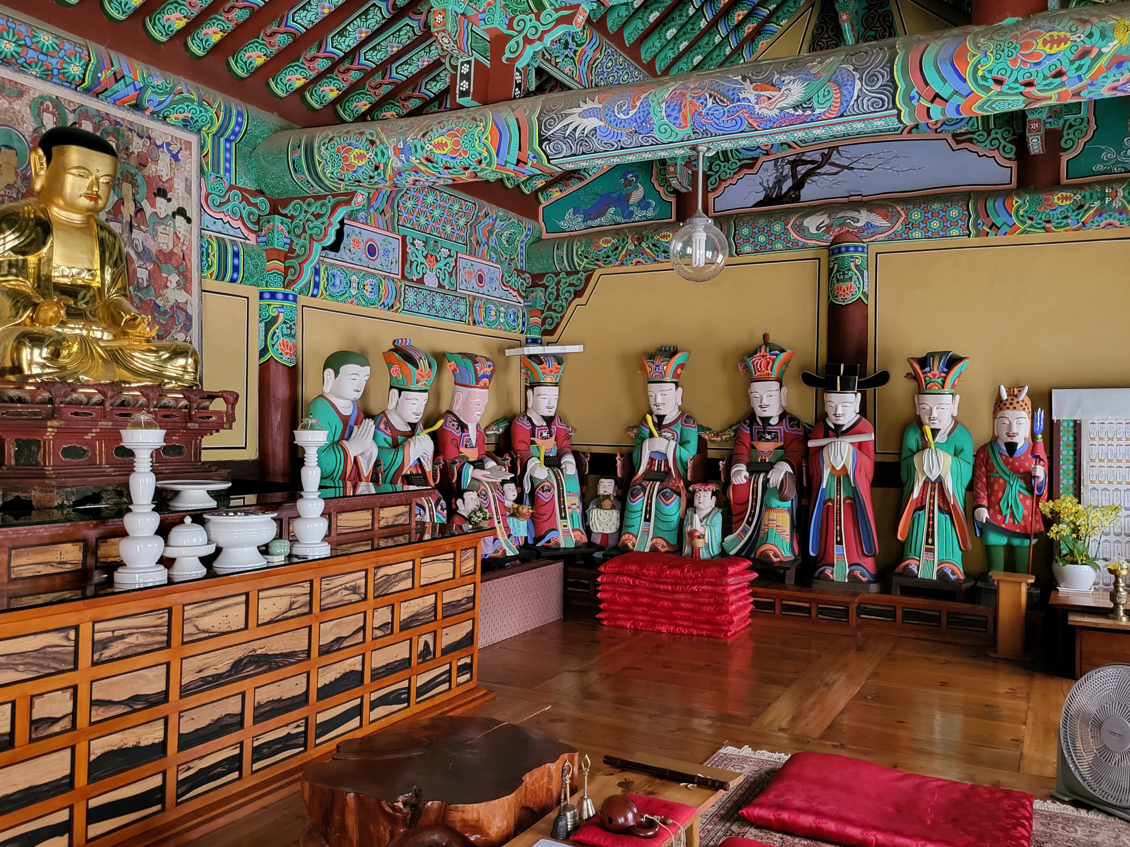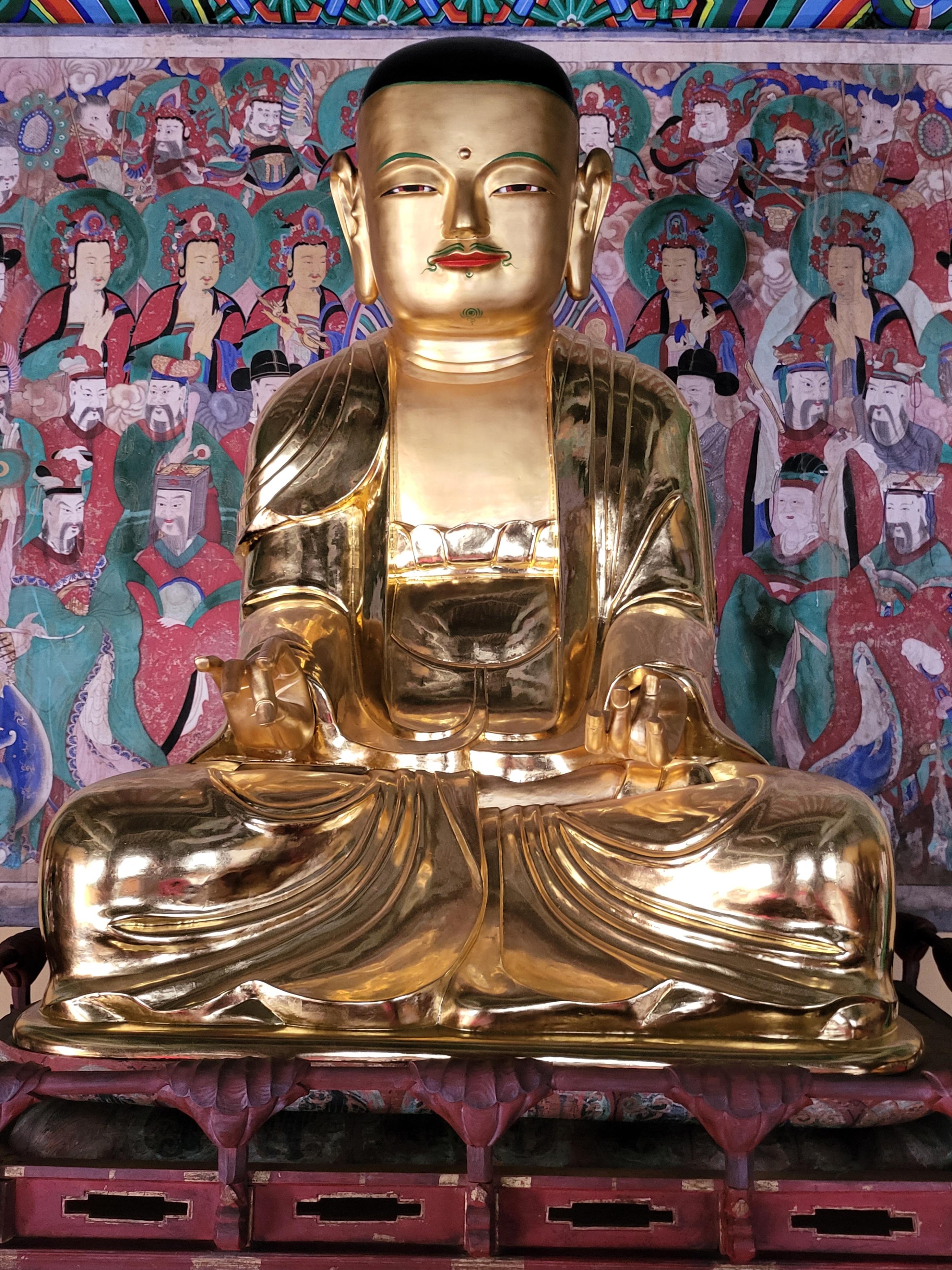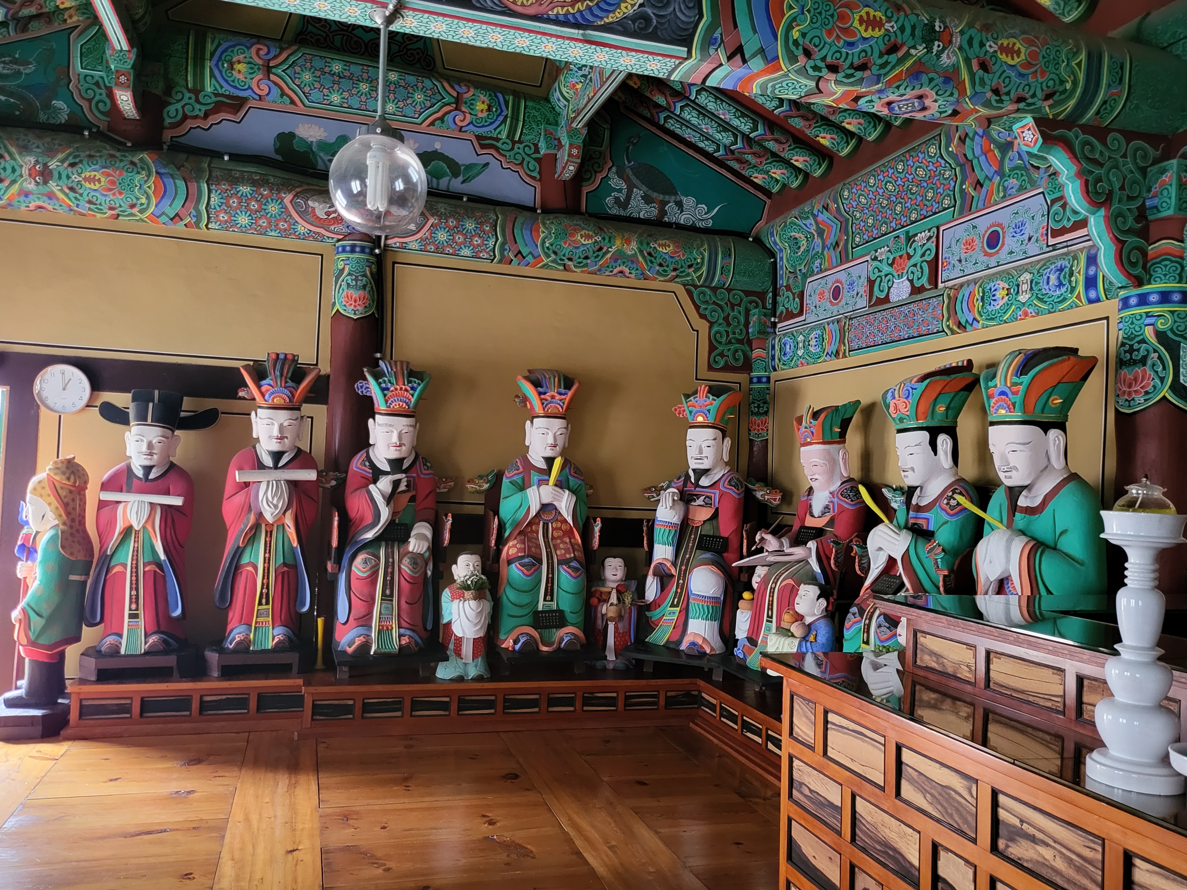 This collection of 19 statues enshrined in Myeongbujeon Hall at Bonggoksa Temple includes a Ksitigarbha Bodhisativa triad, the Ten Underworid Kings, and other members of their retinue.