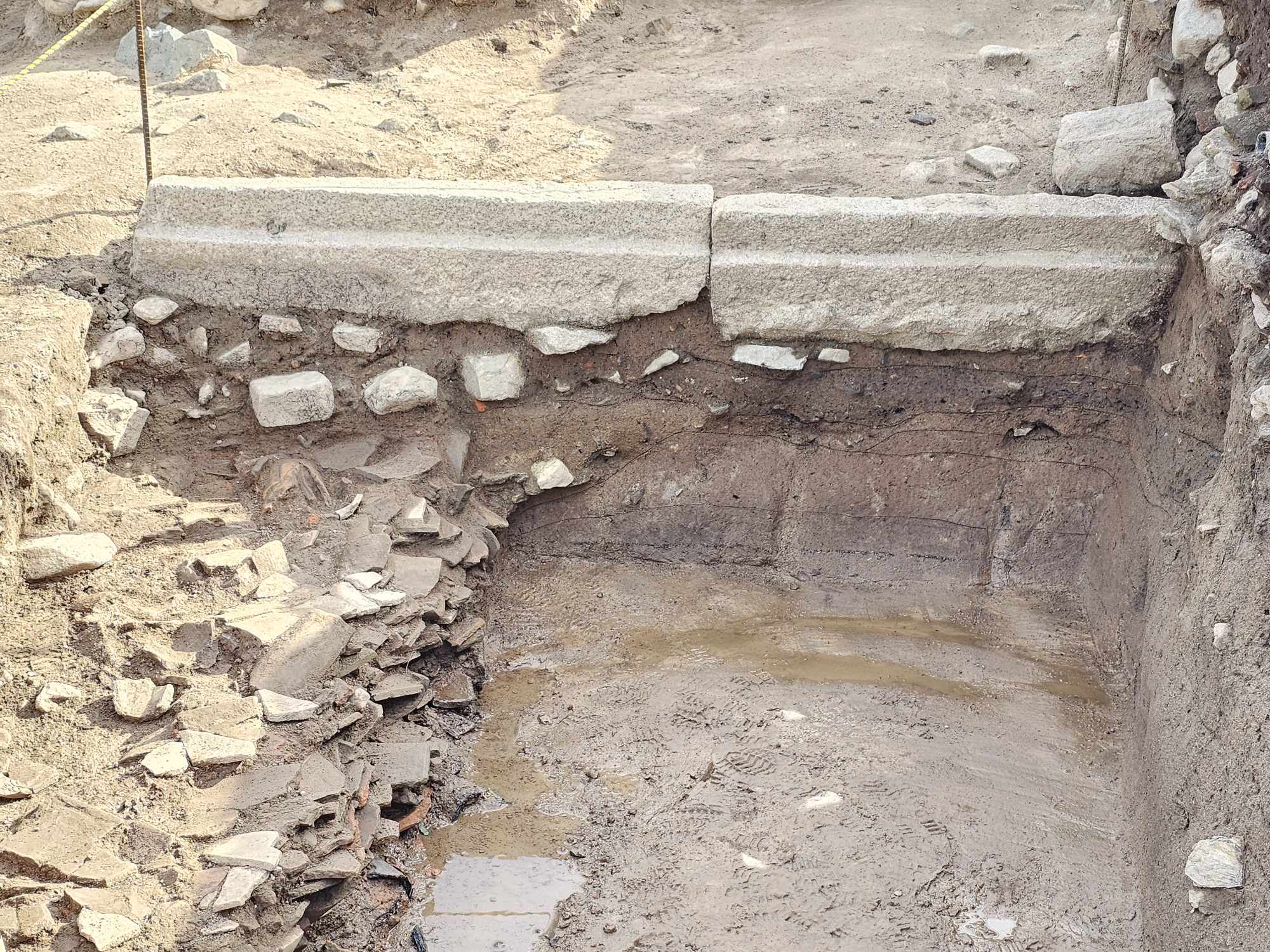 아래층 기와 더미가 보이는데 조사단은 그 형성시점을 기와 분석을 근거로 대략 670년~800년 무렵으로 추정한다.