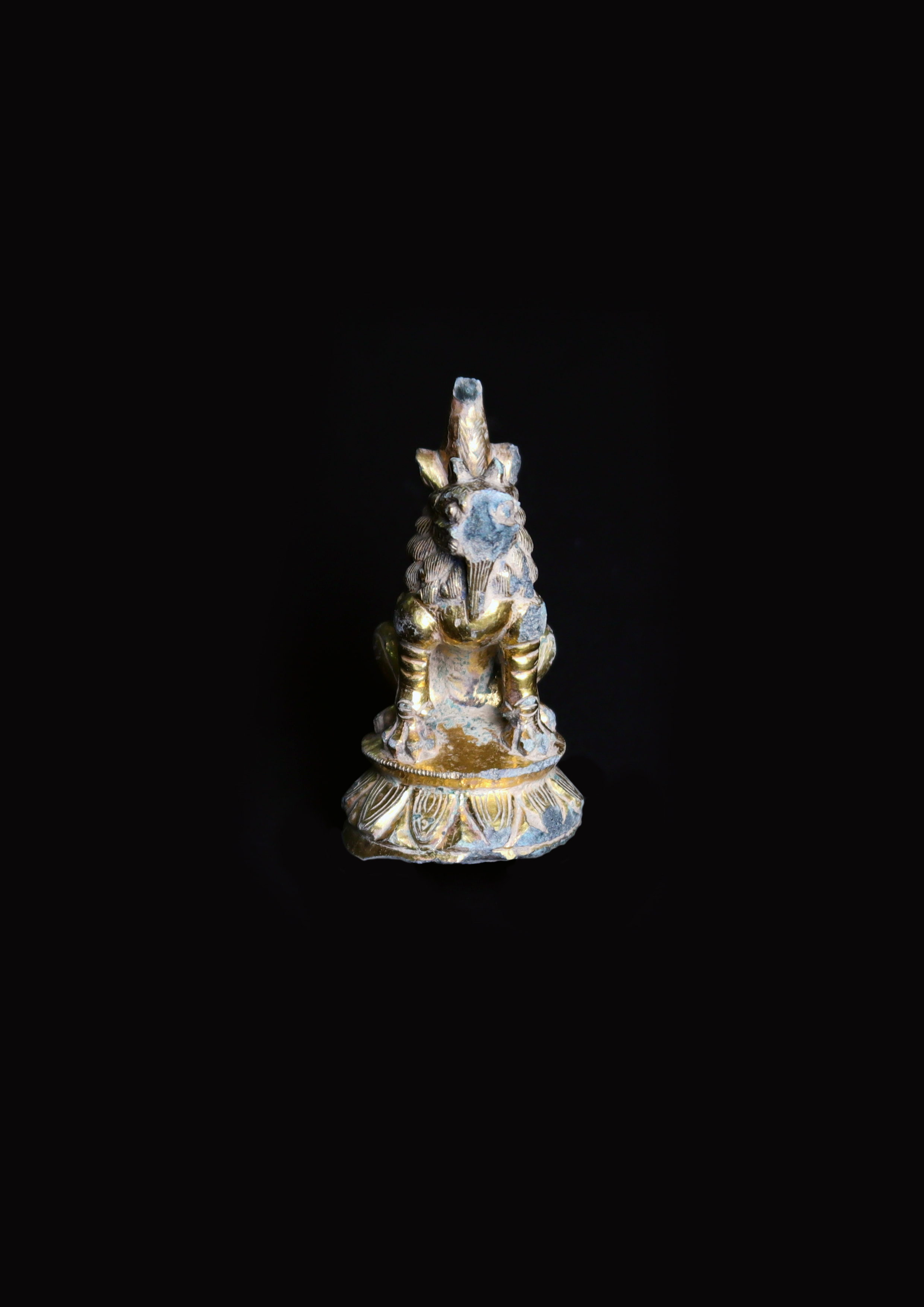 출토된 금동사자상은 사자얼굴 전면부를 비롯한 여러 군데에서 부식이 진행되었지만, 비교적 완전한 형태이다. 사자는 복련(覆蓮)이 시문된 연화좌(蓮華座) 위에 앞다리를 세우고 앉아 있다(6.2cm). 사자 얼굴주위 갈기와 다리, 몸통 등을 정교하게 표현되어 있으며, 세 갈래로 나뉜 사자의 꼬리는 위로 치켜세우고 있다. 부식된 부분을 제외한 전체에 도금이 남아 있다.