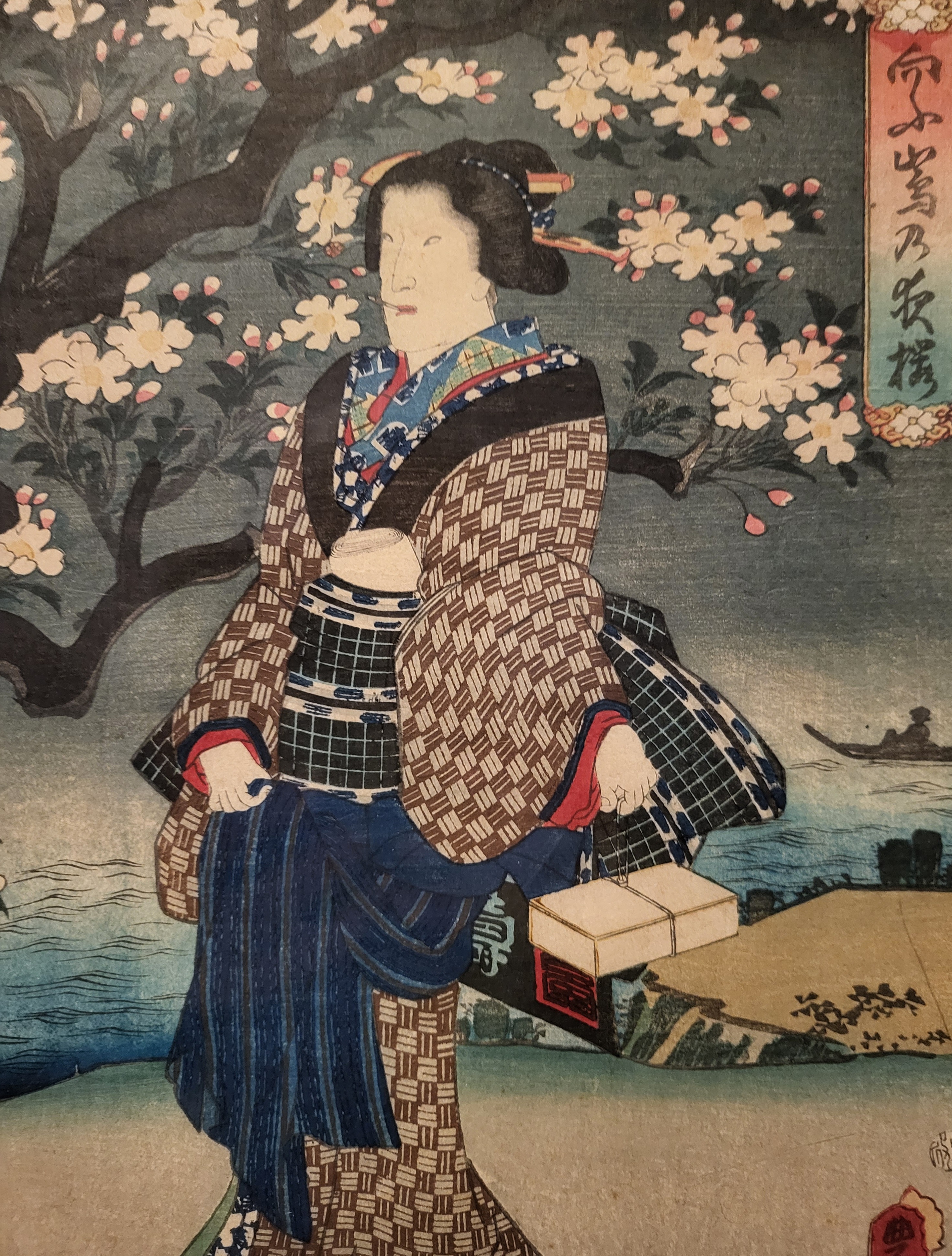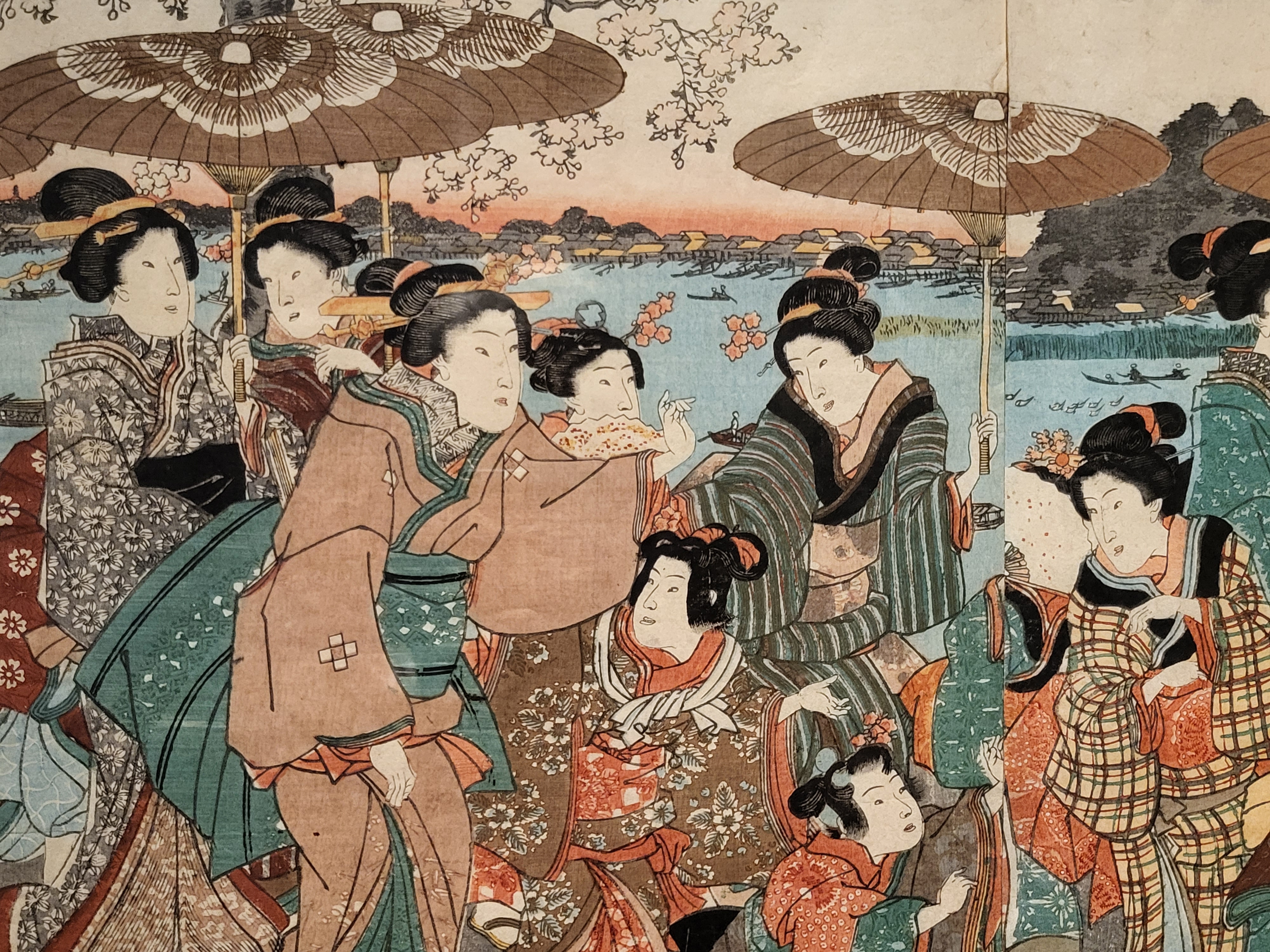 3장의 연속된 화면에 활짝 핀 벚나무를 가득차게 그리고 벚꽃을 구경하는 게이샤 3명을 1장에 1명씩 배치한 구성이 돋보인다.