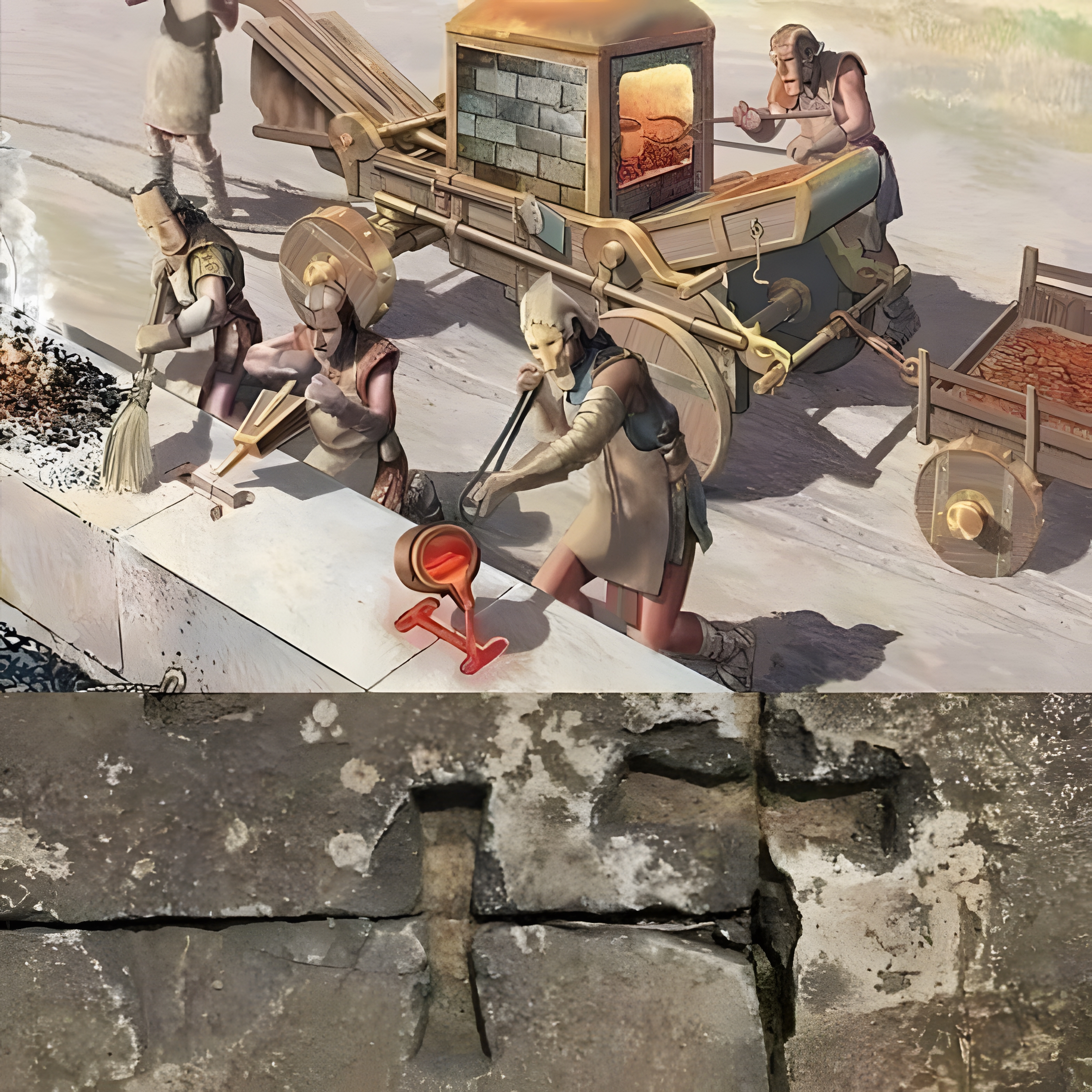지진과 다른 자연적 요인에 저항하기 위해 쌓아 올린 돌을 안정시키기 위해 바위 사이에 철과 납과 같은 금속을 붓는 방식을 소개한 것이라 한다.