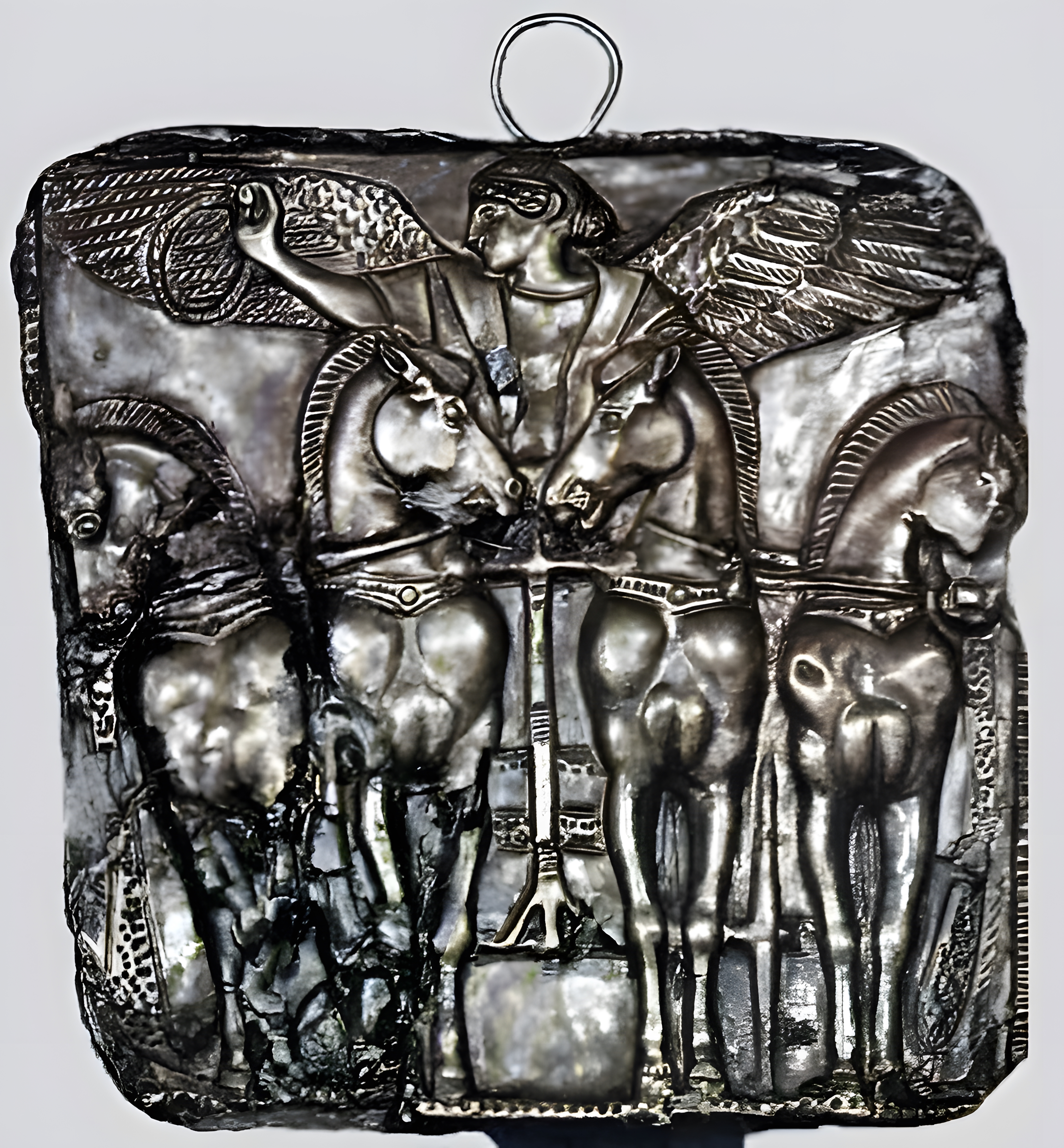 기원전 5세기 중반으로 거슬러 올라가는 트라키아 시대 이 절묘한 유물은 승리의 여신 니케Nike(나이키)가 네 마리 말이 끄는 전차인 쿼드리가quadriga를 타는 모습을 묘사한다.