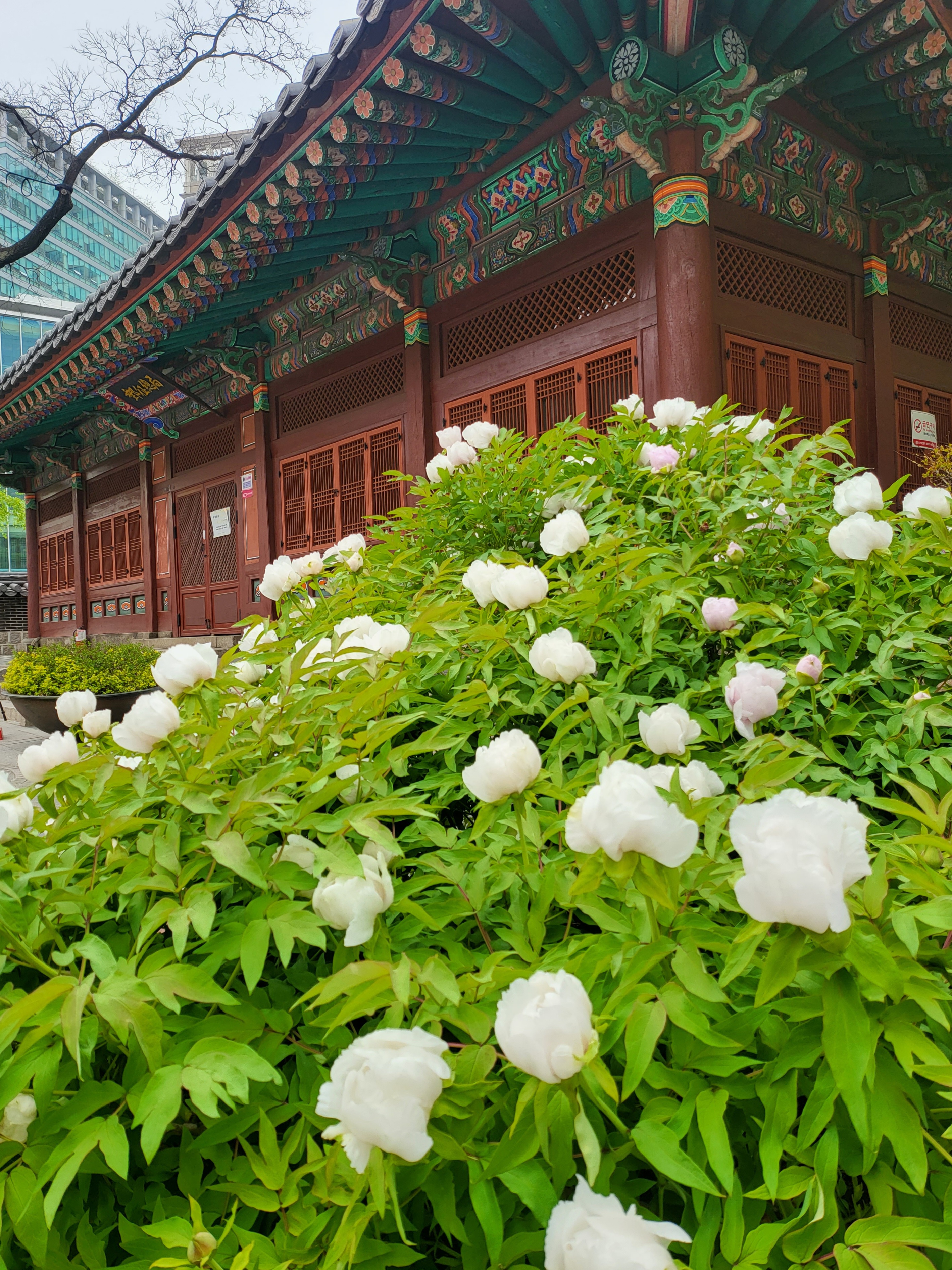 우정총국 자리엔 백모란 한창이고 홍모란 이제 계우 실밥 터졌는데 예는 홍모란 만개 시대다.