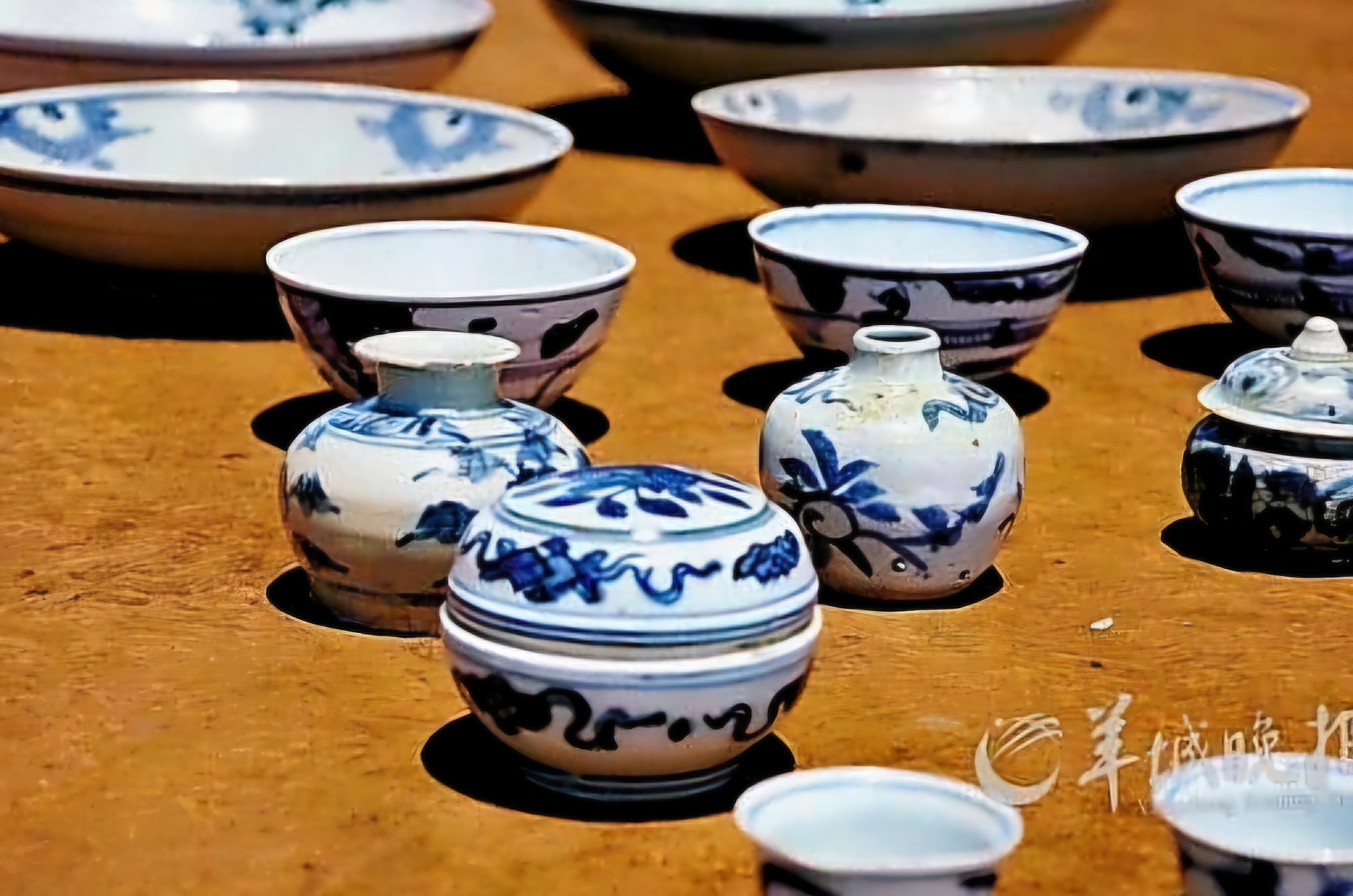 인물과 화훼, 동물 도안을 그려넣은 대반大盘·완碗·관罐·설碟·분盆·발钵·배杯 등의 청화자기青花瓷器 위주이며, 기타 녹도권釉陶罐·철과铁锅·목제품··동판铜板·동분铜盆·철기·동선재铜线材·동라铜锣·동삭铜锁도 출수했다.