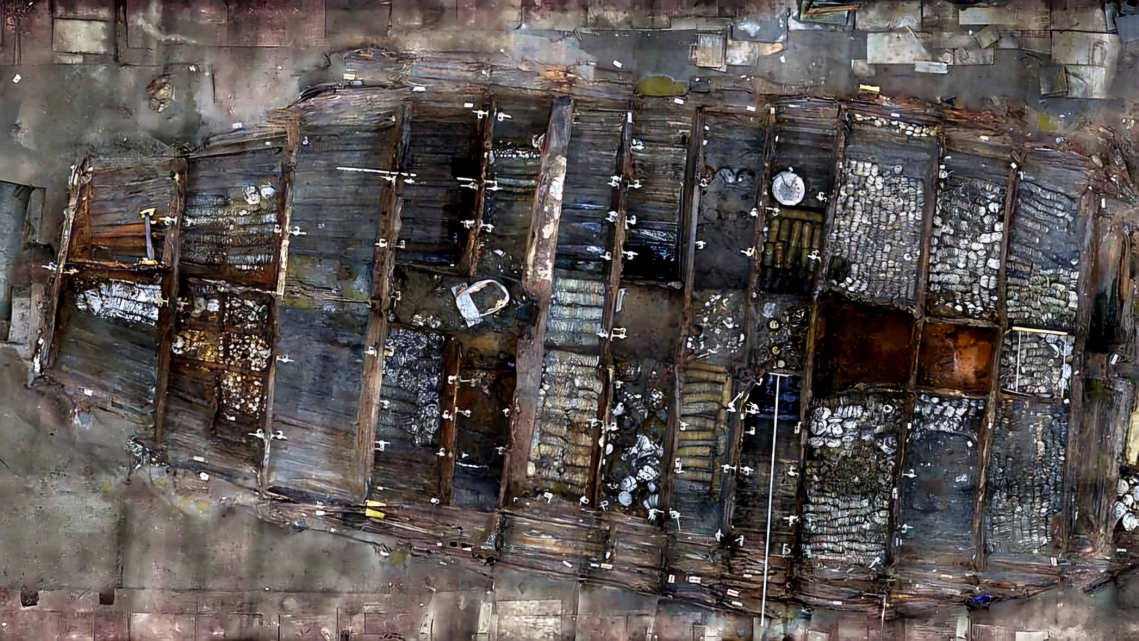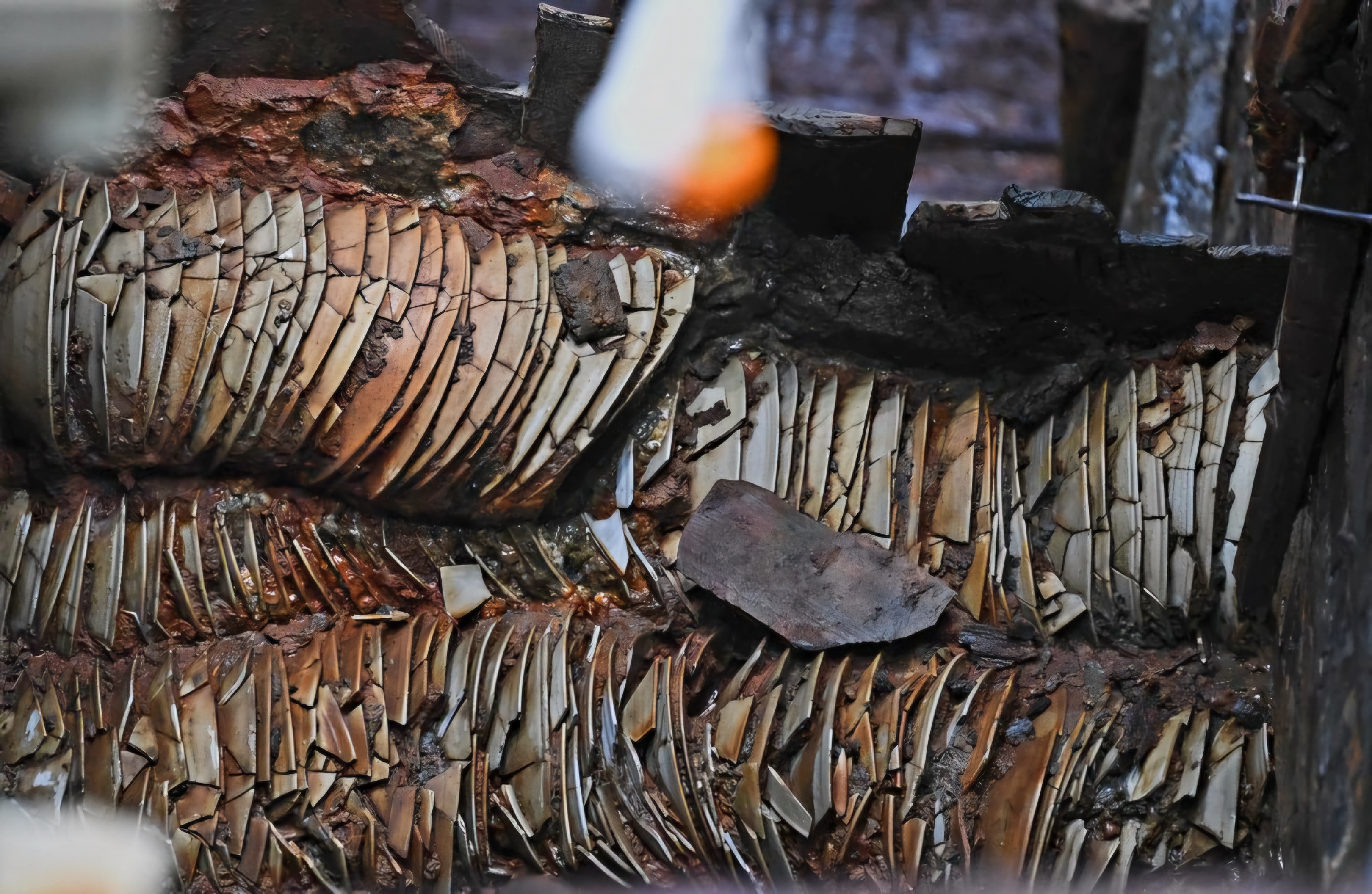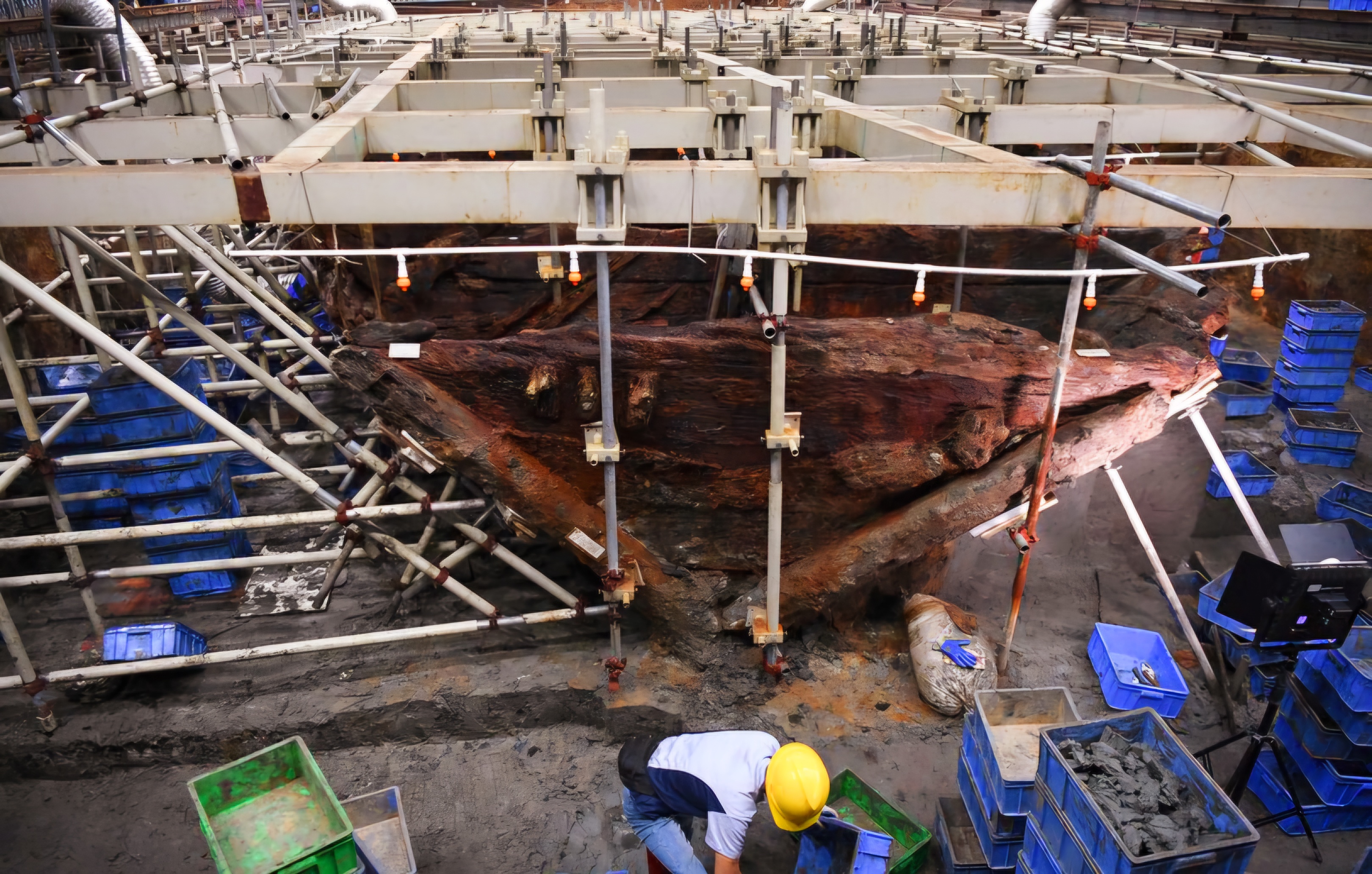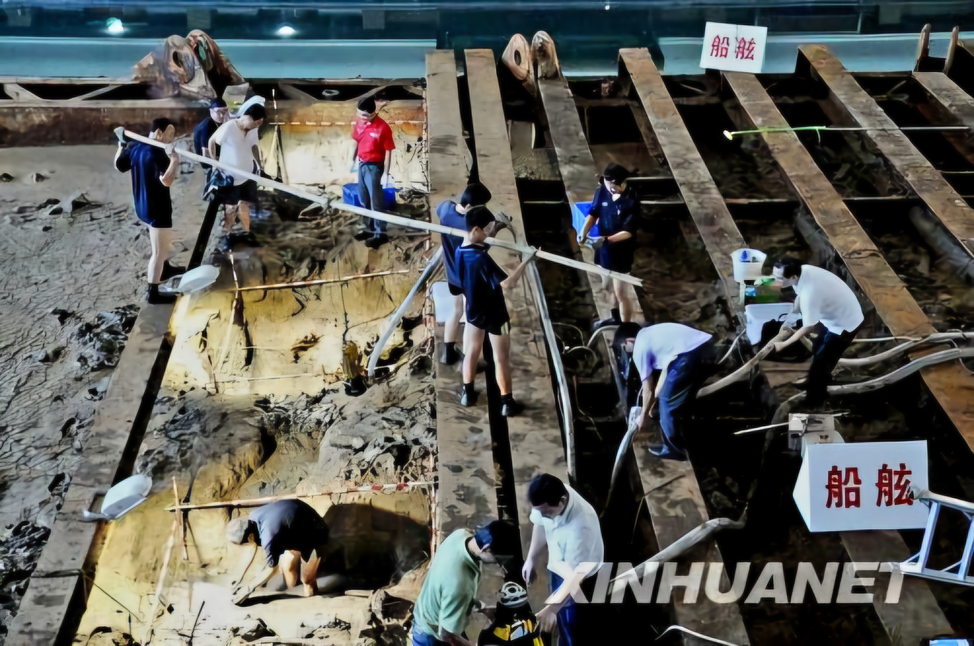 배 중앙 지점 양쪽은 깨끗이 빈 상태이고, 뱃머리는 대향 남쪽이며, 물고기 비늘이 여러 개 겹친 고대 중국 선박 독특한 구조를 보여준다.